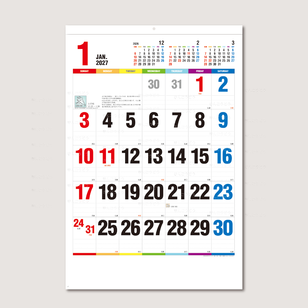 視認性の高いジャンボ文字を使用し、カラフルなカレンダーに仕上げています。楽しくなる12星座の性格も載っています。