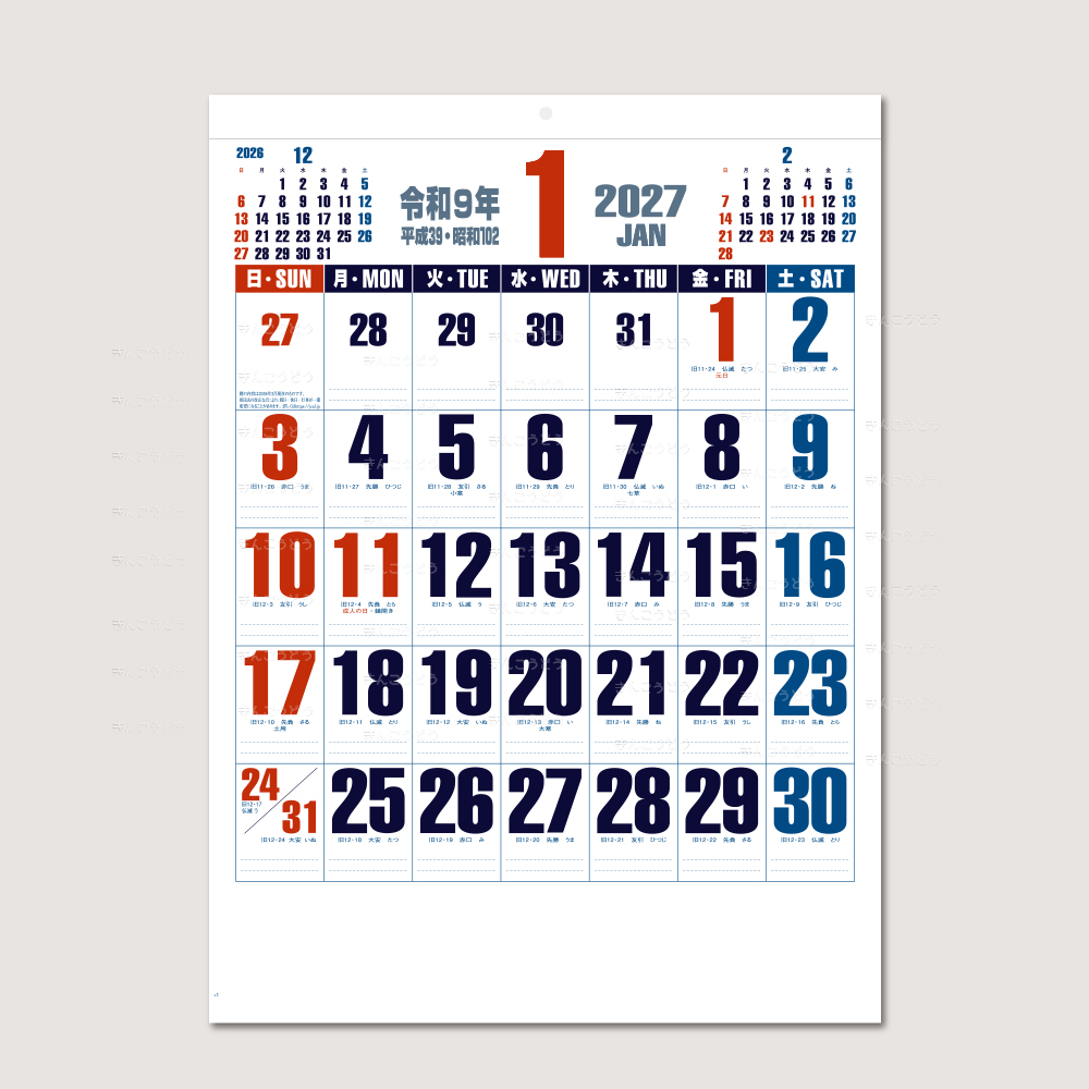 すっきりした大きな文字で見やすさを追求し、目に優しい色使いでさらに使いやすくなったシンプルなカレンダーです。メモ欄も大きく機能性も充実!