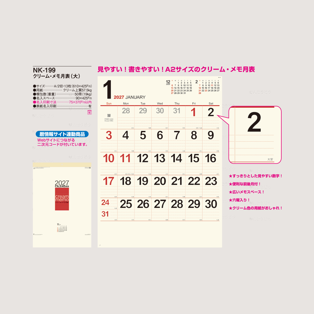 NK-199 クリーム・メモ月表(大)(A/2切・13枚・610×425mm)