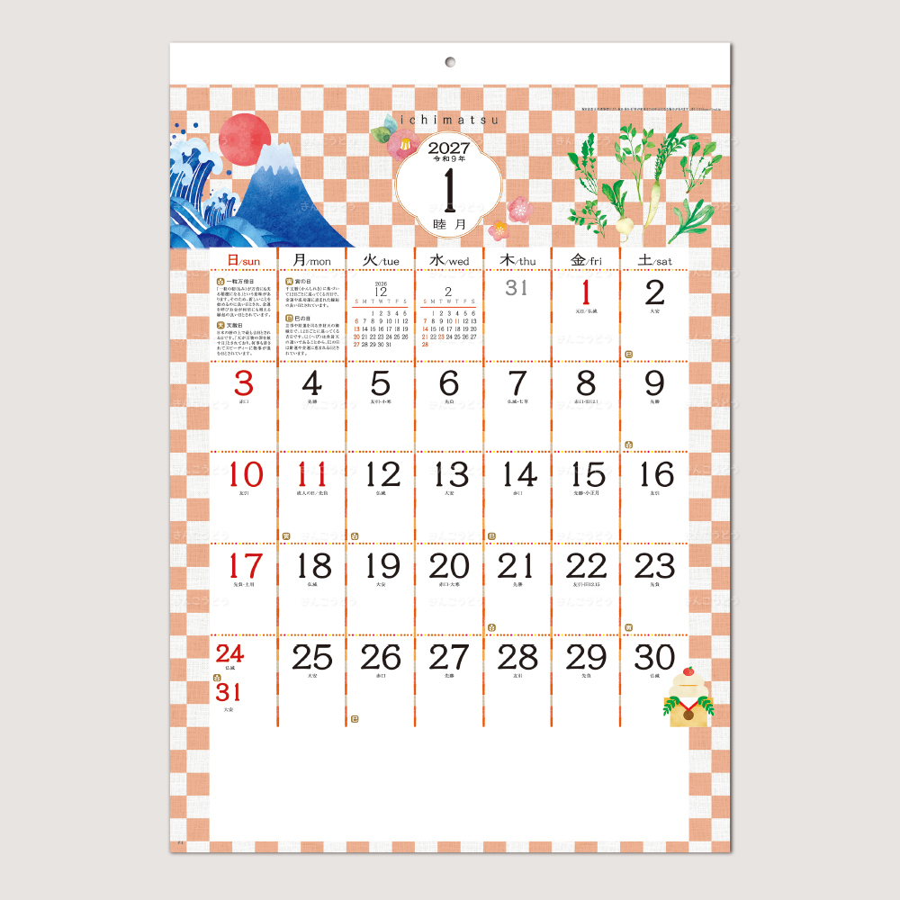 古来から用いられている模様。江戸時代からは市松模様という名で親しまれています。日本の季節を感じさせる和のデザインと共に仕上がった商品です。多くの方に興味を持っていただけるカレンダーとなるでしょう。