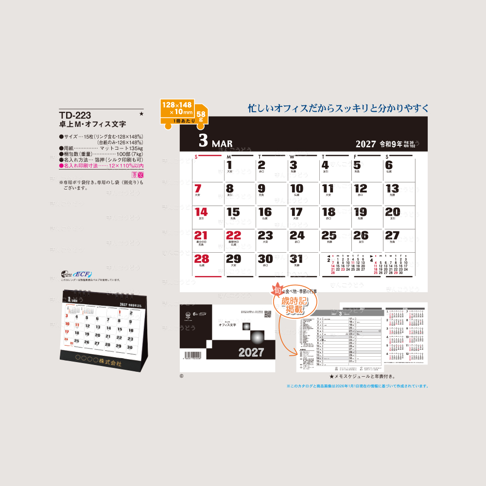 既製品カレンダーからお好きな商品・豊富な品揃えでお好みの品番のカレンダーに名入れをしてお届けいたします。