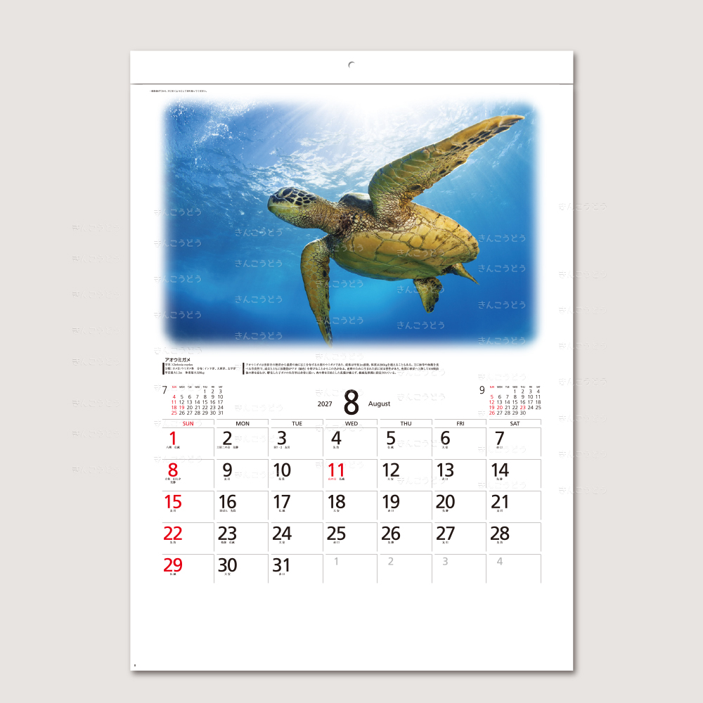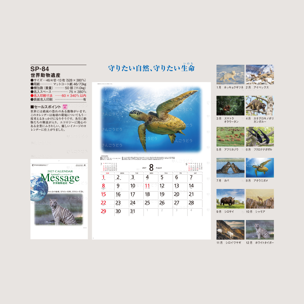世界には絶滅の恐れのある動物がいます。このカレンダーは地球の環境についてもう一度考えるきっかけになりそうです。各月に動物たちの解説が入り、エコロジーに関心のある企業にふさわしい、優しいイメージのカレンダーに仕上がりました。