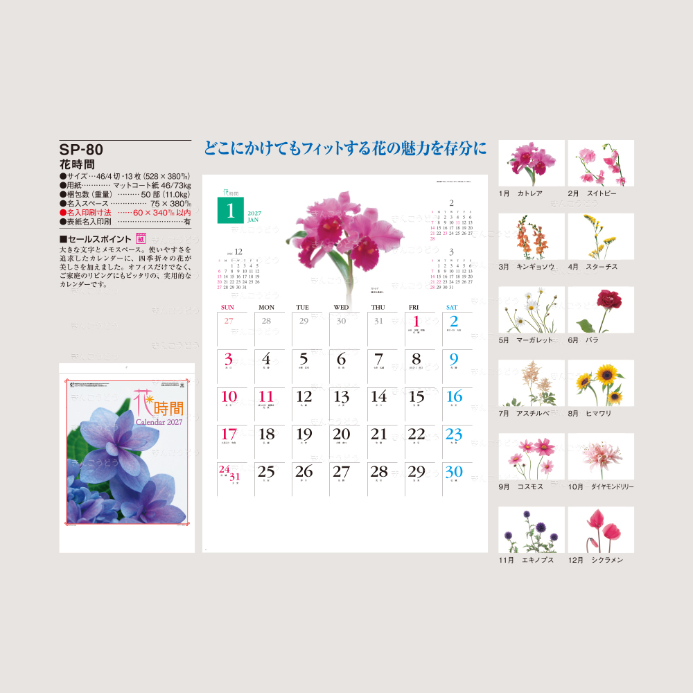 ●1月・カレンジュラ ●2月・バラ ●3月・サクラ ●4月・ツルニチニチソウ ●5月・ナデシコ ●6月・デルフィニウム ●7月・トルコキキョウ ●8月・アンスリウム ●9月・クラスベディア ●10月・リンドウ ●11月・ケイトウ ●12月・グロリオサ