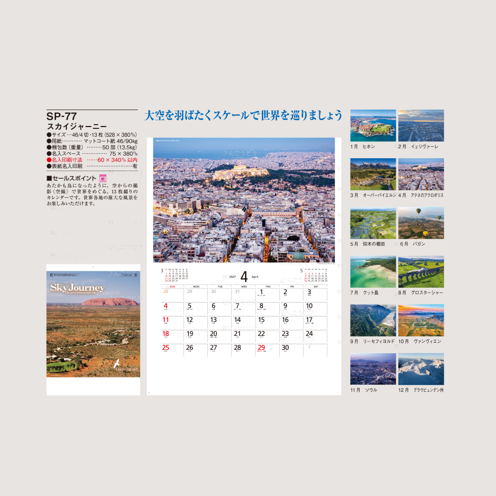 あたかも鳥になったように、空から撮影(空撮)で世界をめぐる、13枚綴りのカレンダーです。世界各地の雄大な風景をお楽しみいただけます。