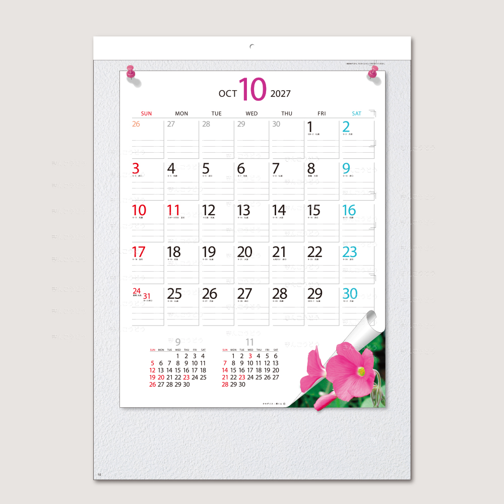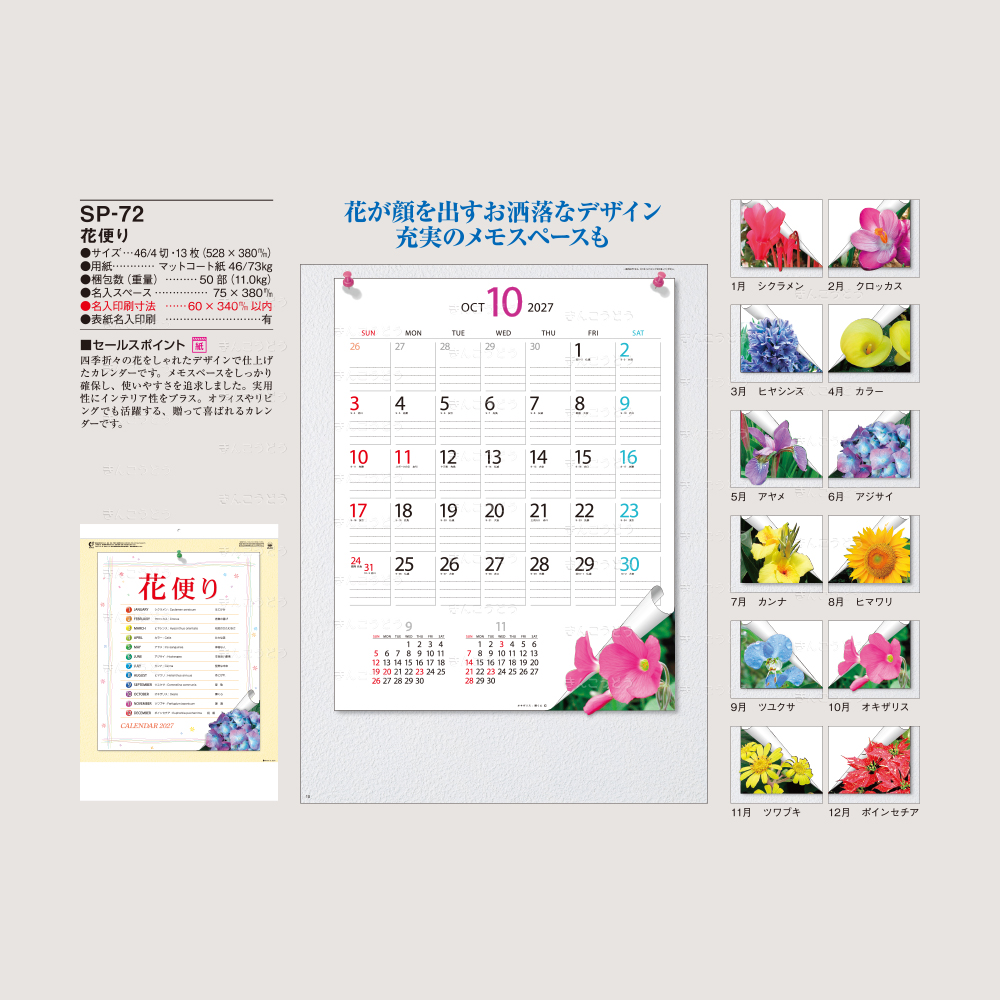 四季折々の花をしゃれたデザインで仕上げたカレンダーです。メモスペースをしっかり確保し、使いやすさを追求しました。実用性にインテリア性をプラス。オフィスやリビングでも活躍する、贈って喜ばれるカレンダーです。