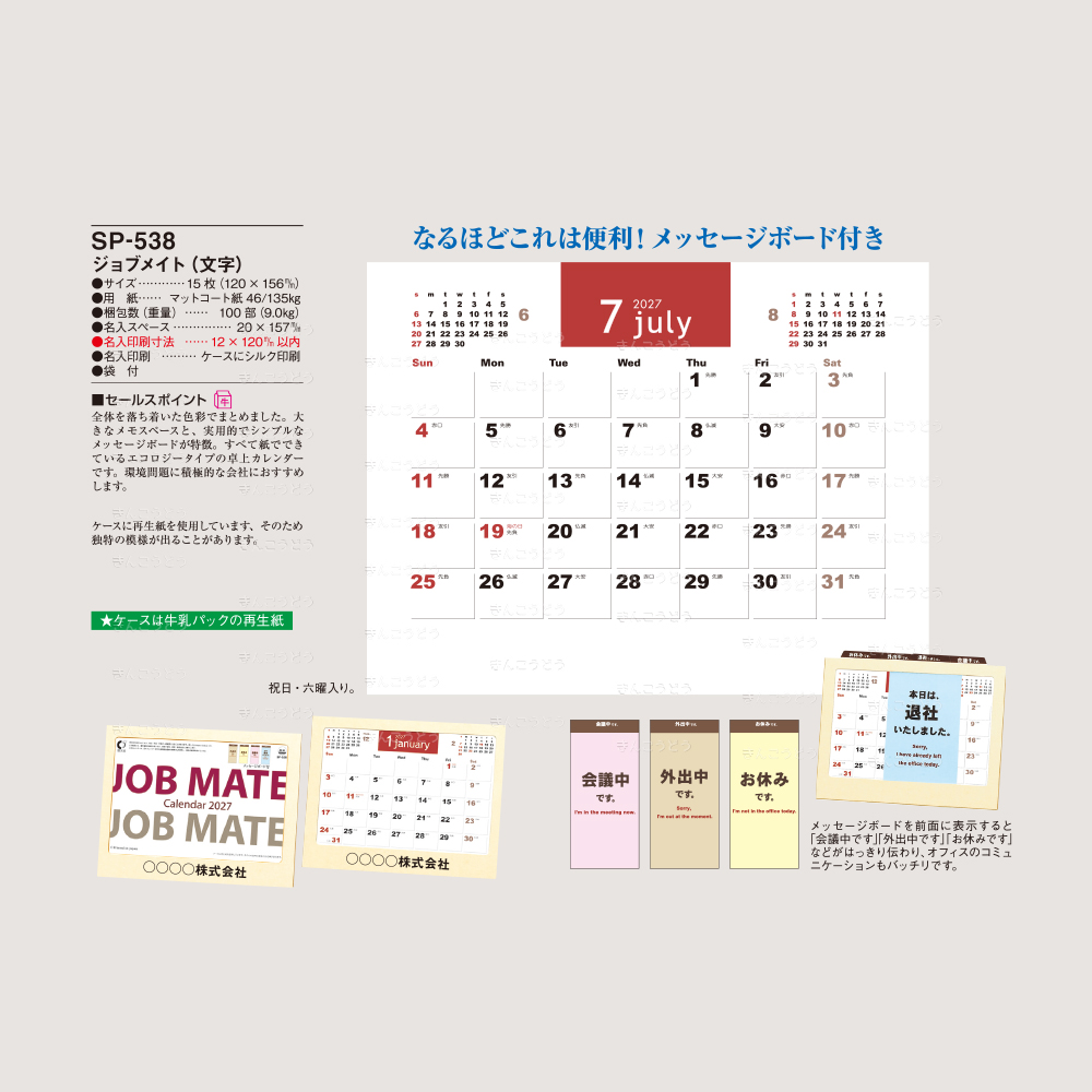 全体を落ち着いた色彩でまとめました。大きなメモスペースと、実用的でシンプルなメッセージボードが特徴。すべて紙でできているエコロジータイプの卓上カレンダーです。環境問題に積極的な会社におすすめします。