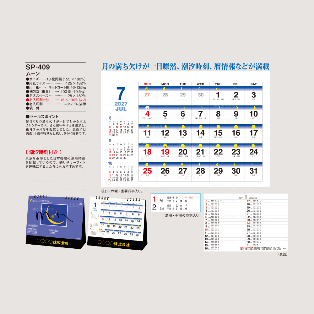 毎日の月の満ち欠けが一目でわかる卓上カレンダーです。また使いやすさを追求し、後月3か月分を配置しました。裏面には満潮、干潮の時刻も記載し、さらに便利です。