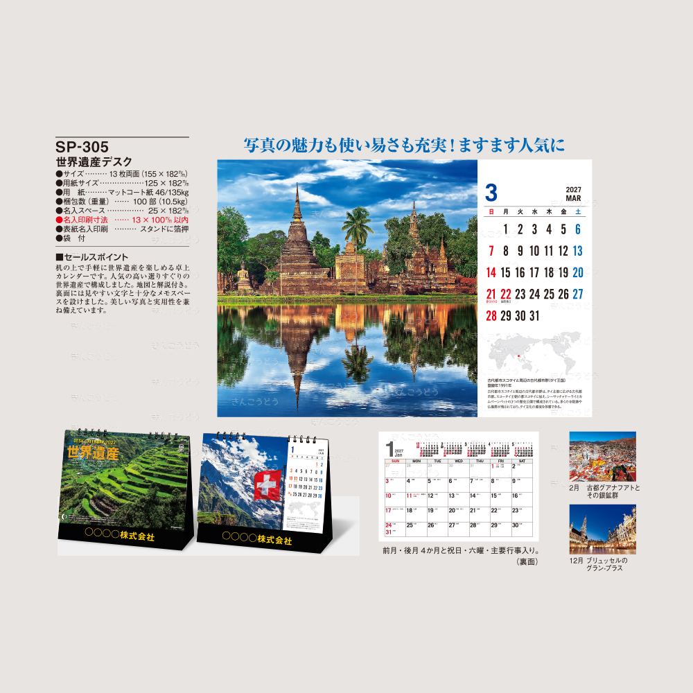 机の上で手軽に世界遺産を楽しめる、と評判の卓上カレンダーです。人気の高い選りすぐりの世界遺産で構成しました。地図と解説付き。裏面には見やすい文字と十分なメモスペースを設けました。美しい写真と実用性を兼ね備えています。