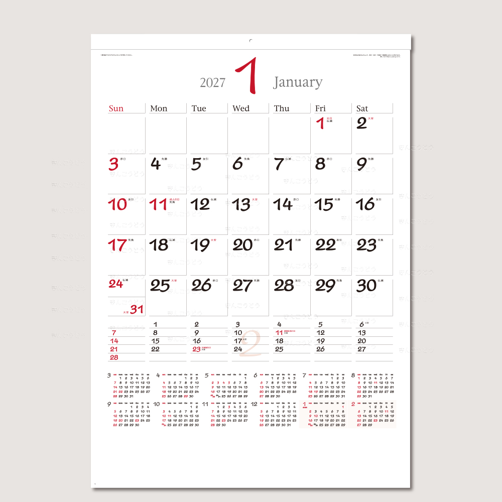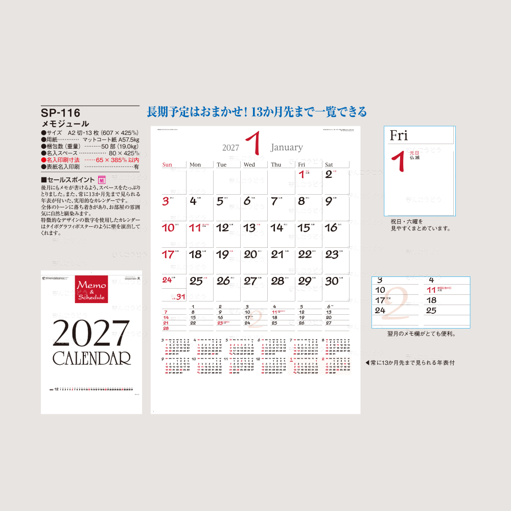 既製品カレンダーからお好きな商品・豊富な品揃えでお好みの品番のカレンダーに名入れをしてお届けいたします。
