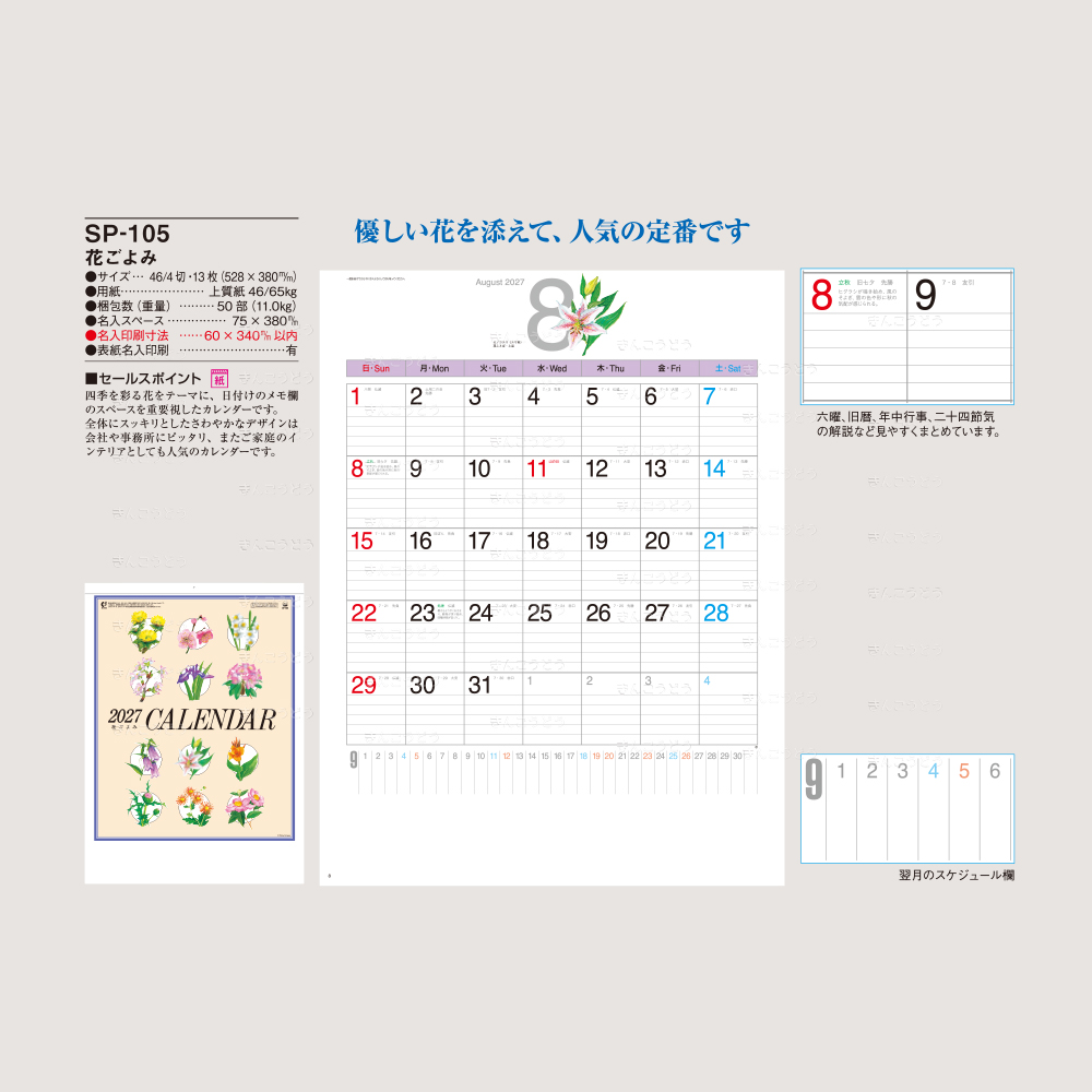 四季を彩る花をテーマに、日付のメモ欄のスペースを重要視したカレンダーです。