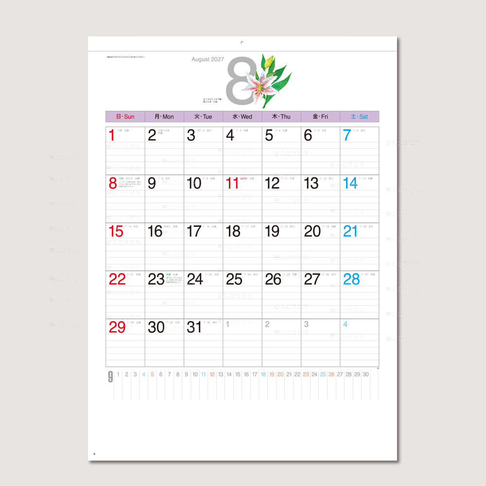 全体にスッキリとしたさわやかなデザインは会社や事務所にピッタリ。またご家庭のインテリアとしても人気のカレンダーです。