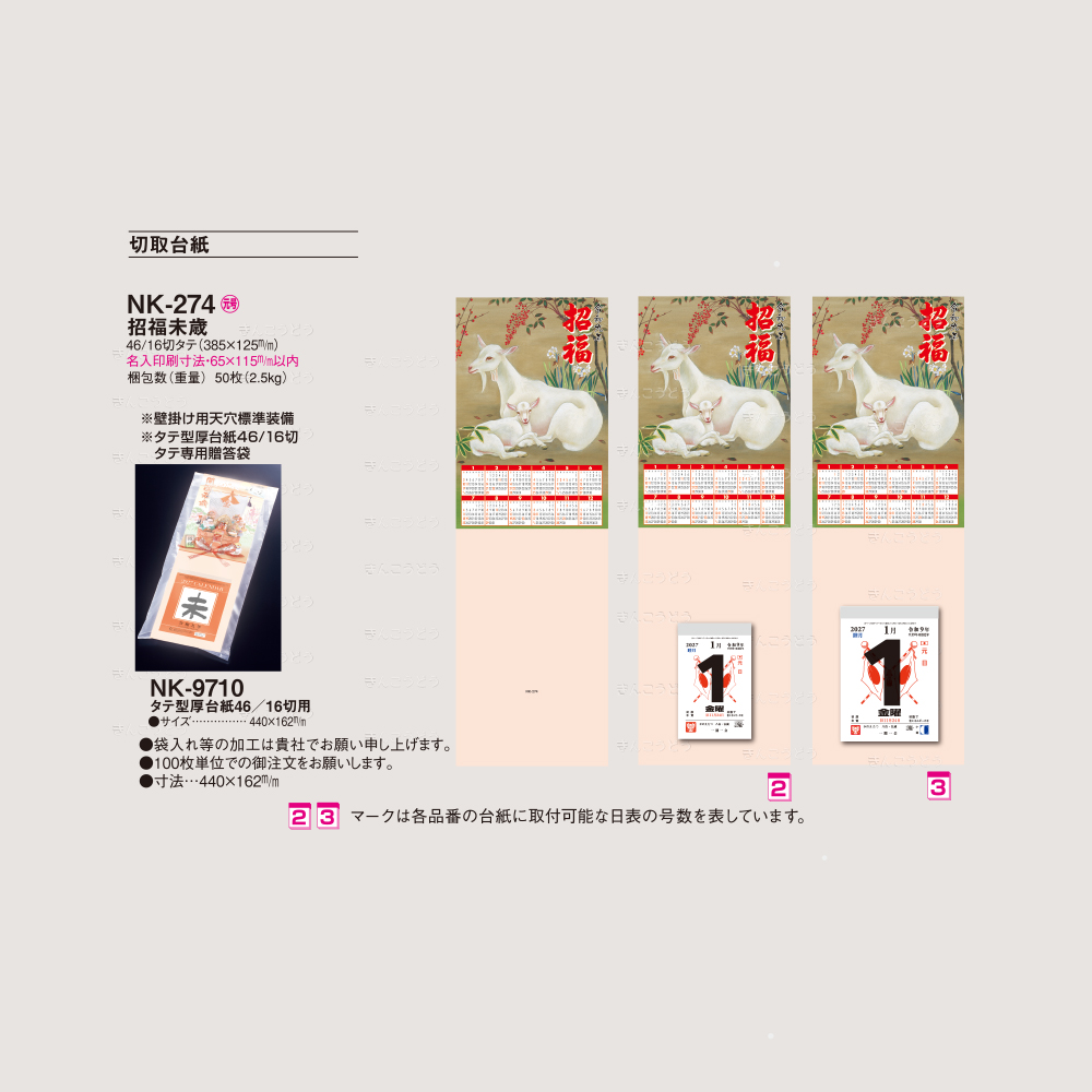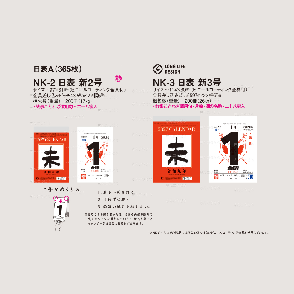 | 梱包数(重量) | 台紙・50枚(2.5Kg)|日めくり・200冊(17Kg) |