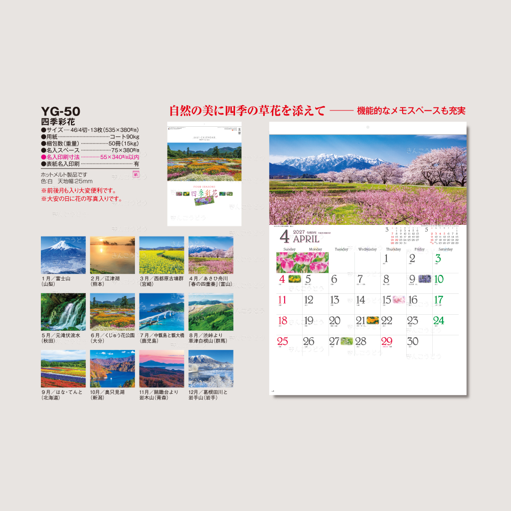 ●1月・富士山(山梨) ●2月・館山市(千葉) ●3月・筑波山(茨城) ●4月・浜松市(静岡) ●5月・苗名滝(新潟) ●6月・フラワーパーク浦島(香川) ●7月・鳥海湖と鳥海山(山形) ●8月・父島 二見湾(東京) ●9月・尾瀬ヶ原と燈ヶ岳(群馬) ●10月・あわじ花さじき(兵庫) ●11月・法体の滝(秋田) ●12月・野尻湖と妙高山(長野)