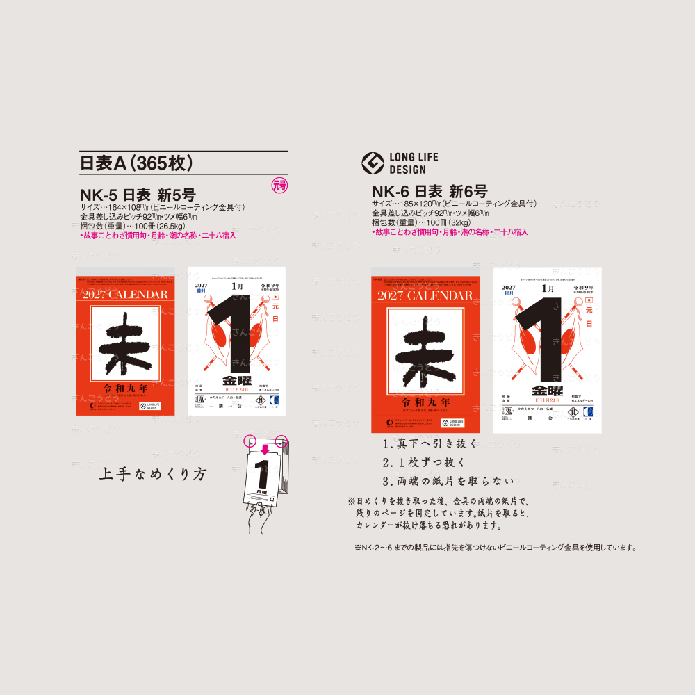 | 梱包数(重量) | 台・50枚(7.5Kg)|日めくり・100冊(32Kg) |