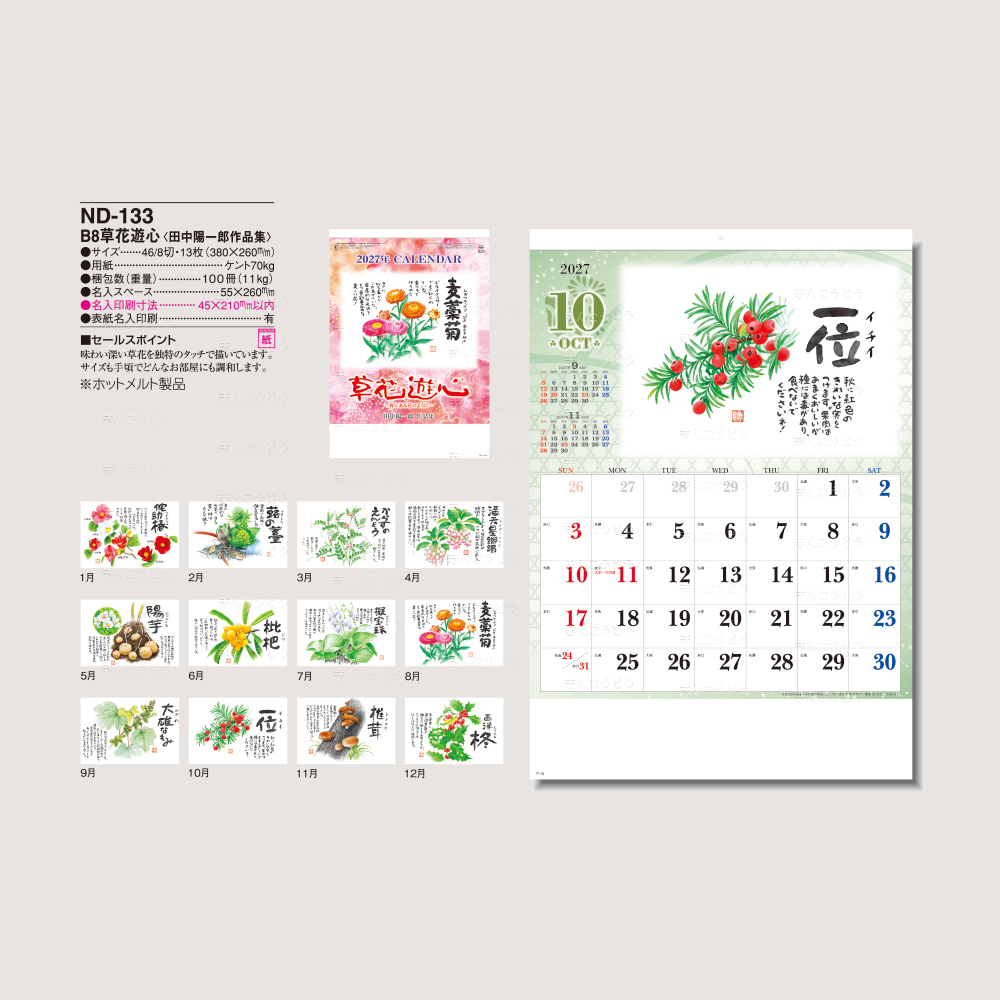 既製品カレンダーからお好きな商品・豊富な品揃えでお好みの品番のカレンダーに名入れをしてお届けいたします。