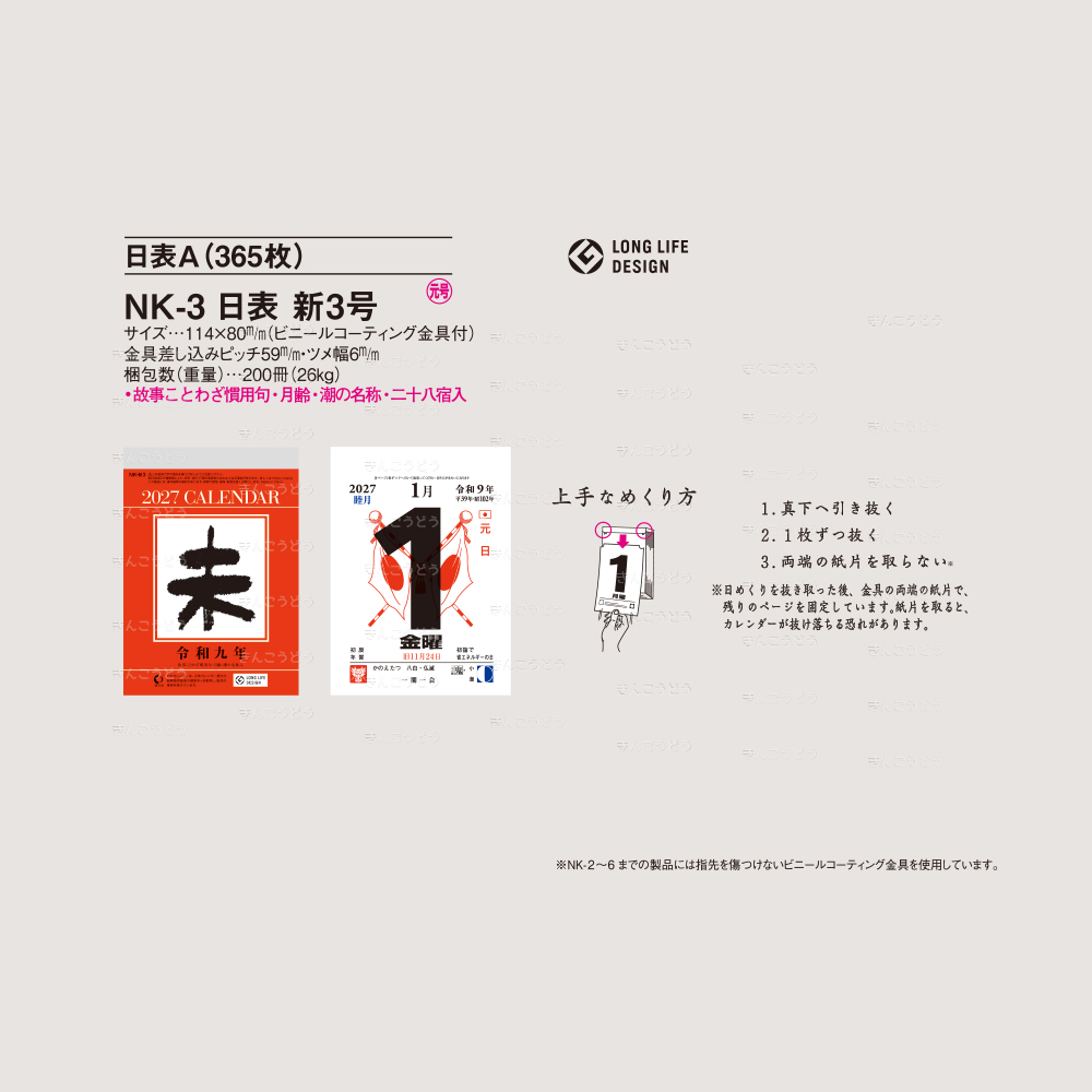 | 梱包数(重量) | 台紙・50枚(3Kg) |日めくり・200冊(26Kg) |