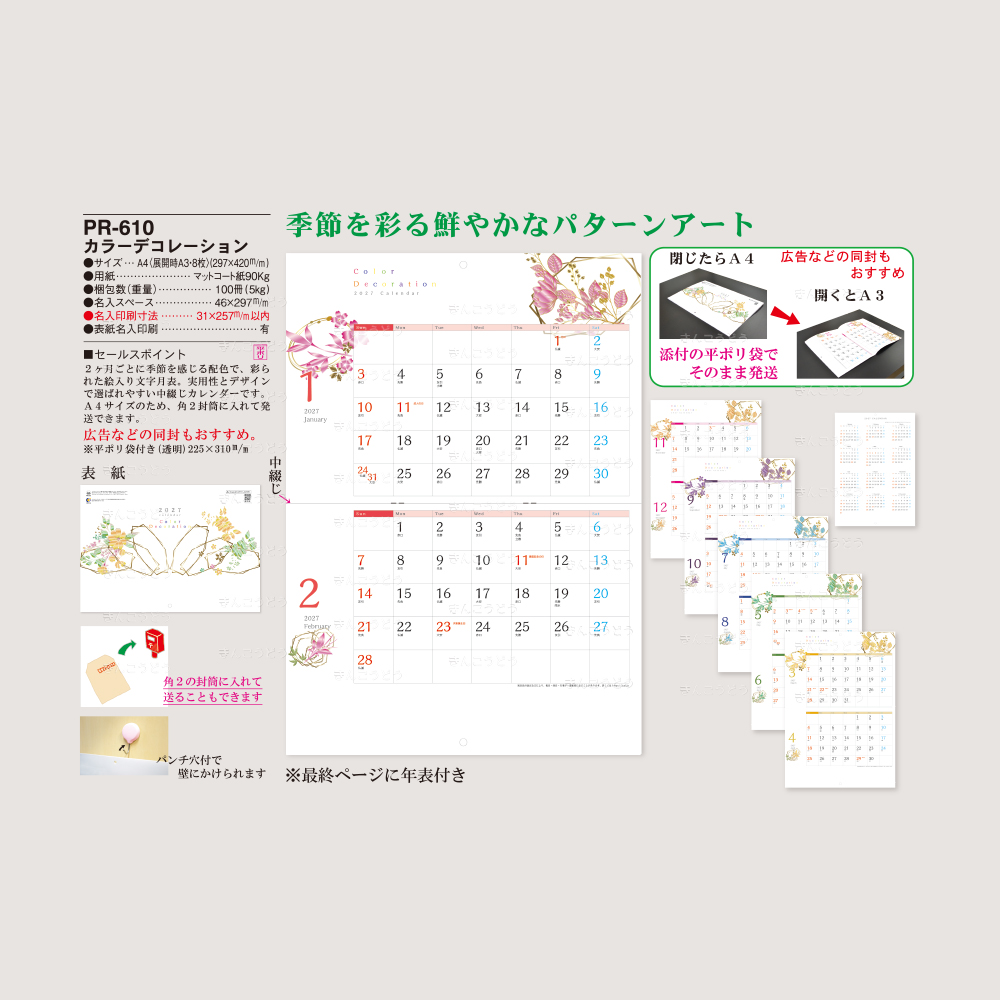 2ヶ月ごとに季節を感じる配色で、彩られた絵入り文字月表。実用性とデザインで選ばれやすい中綴じカレンダーです。A4サイズのため、角2封筒に入れて発送出来ます。