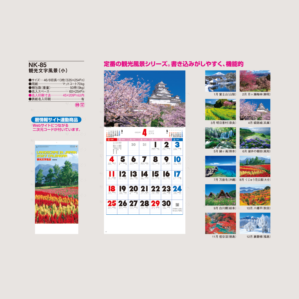 ●1月・富士山(山梨) ●2月・月ヶ瀬梅林(静岡) ●3月・明日香村(奈良) ●4月・姫路城(兵庫) ●5月・鍋ケ滝(熊本) ●6月・溜井の棚田(高知) ●7月・万座毛(沖縄) ●8月・くじゅう花公園(大分) ●9月・白川郷(岐阜) ●10月・八幡平(秋田) ●11月・祖谷渓(徳島) ●12月・裏磐悌(福島)