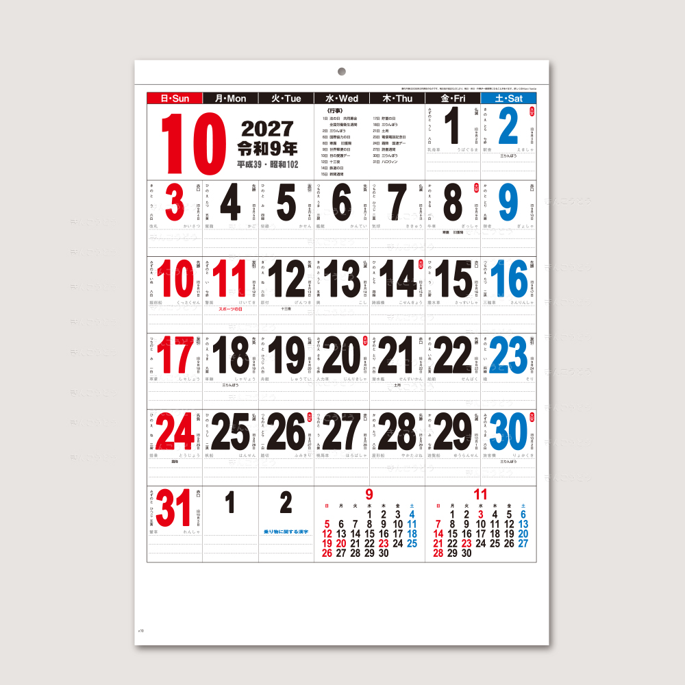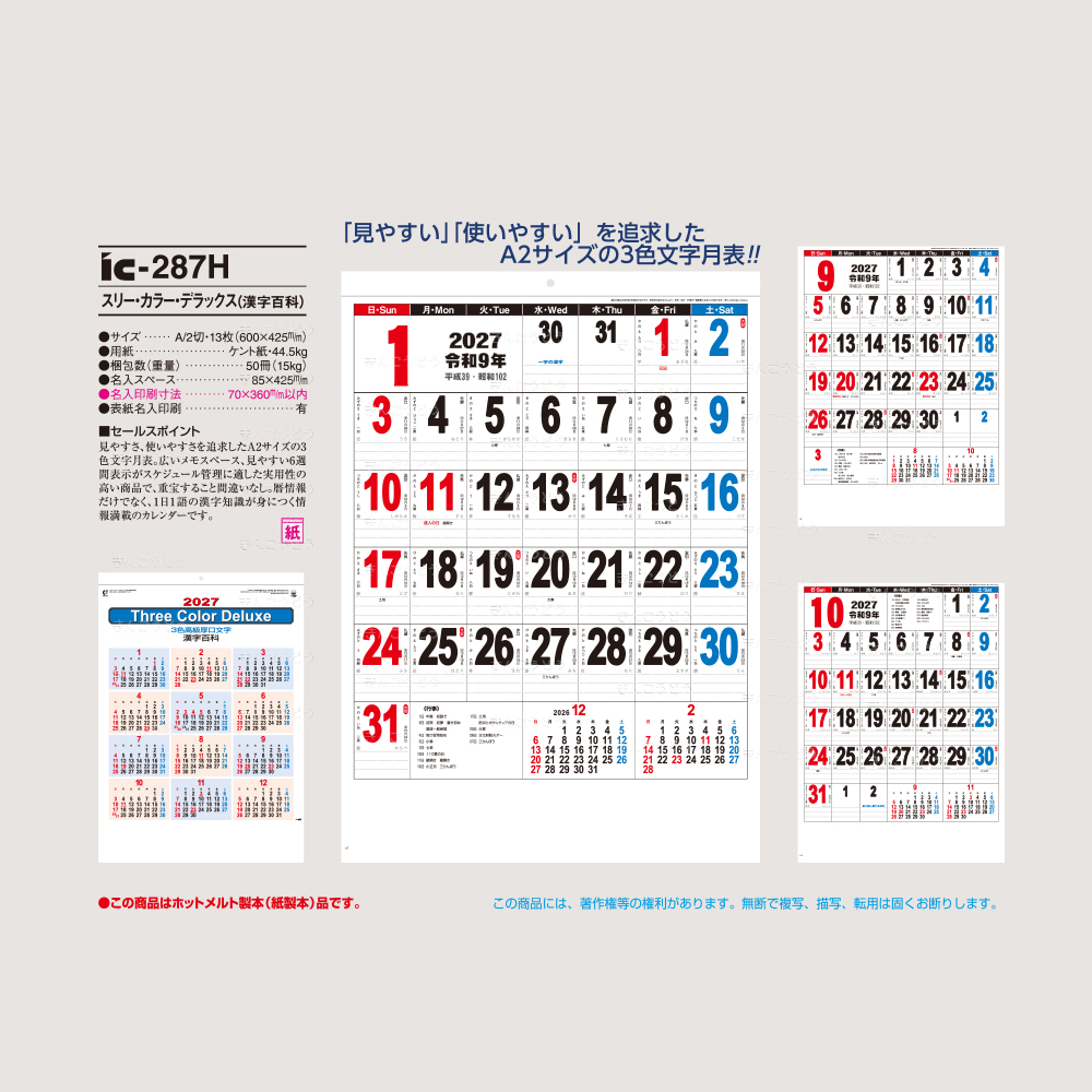 「見やすい!!」「使いやすい!」を追求したA2サイズの3色文字月表‼