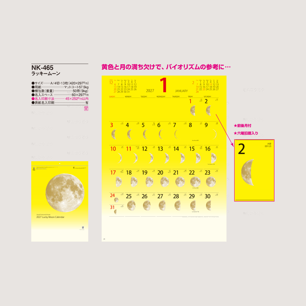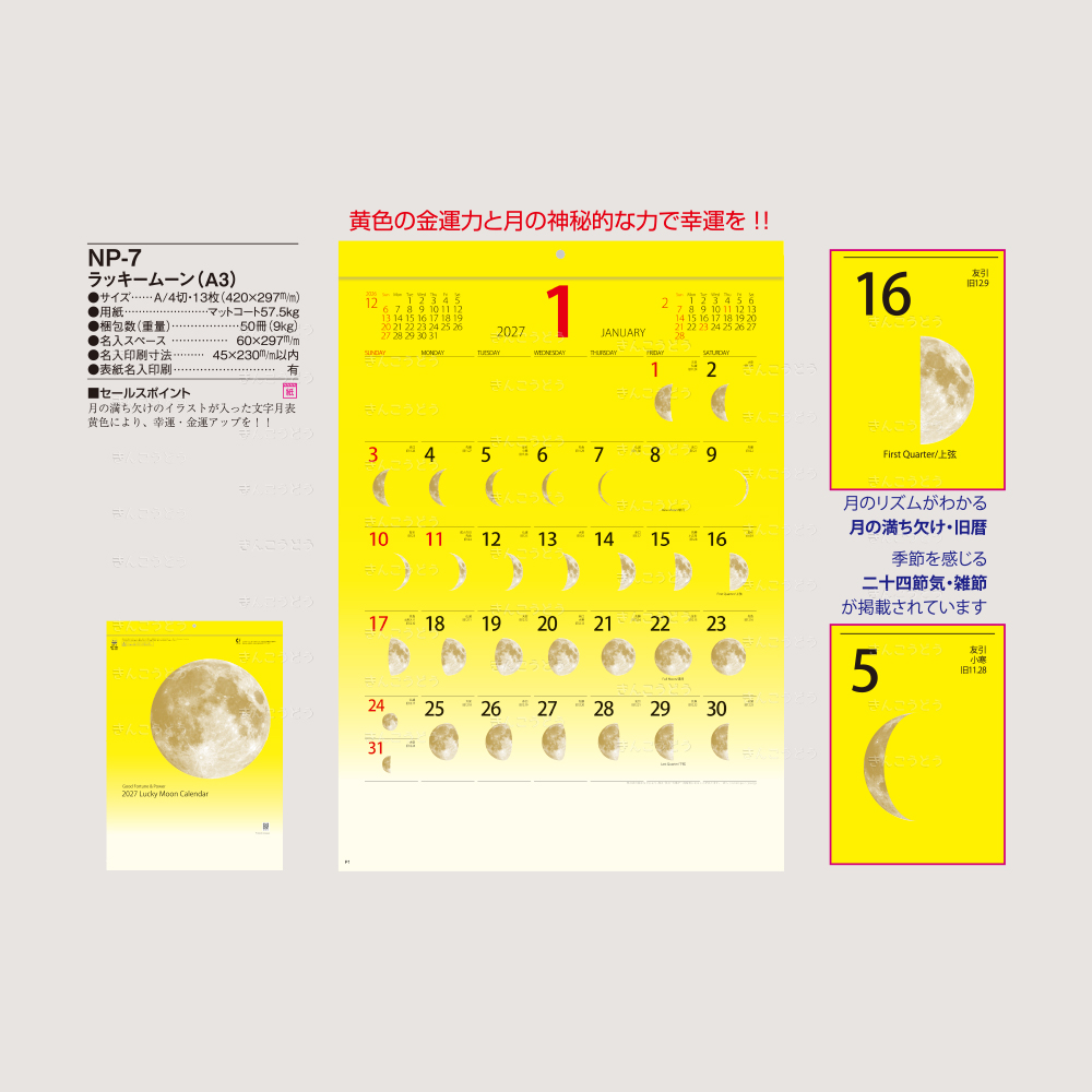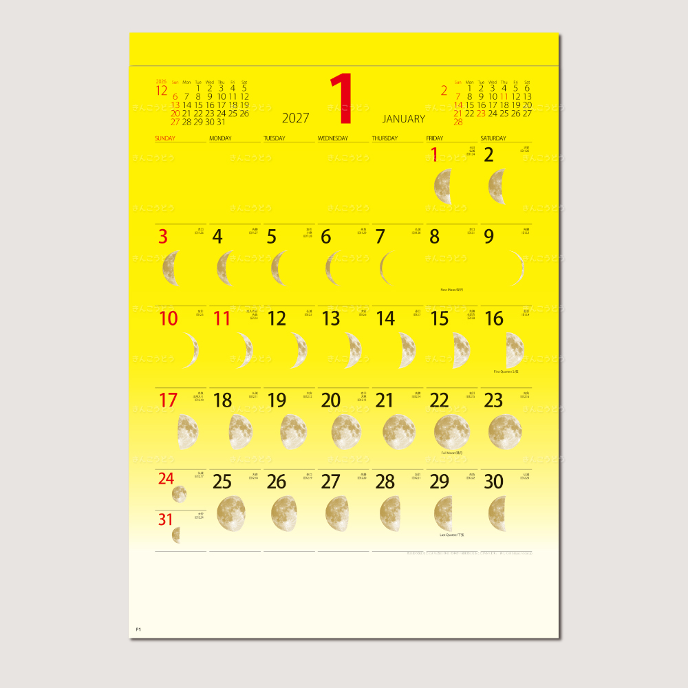月の満ち欠けのイラストが入った文字月表。黄色により、幸運・金運アップを!!