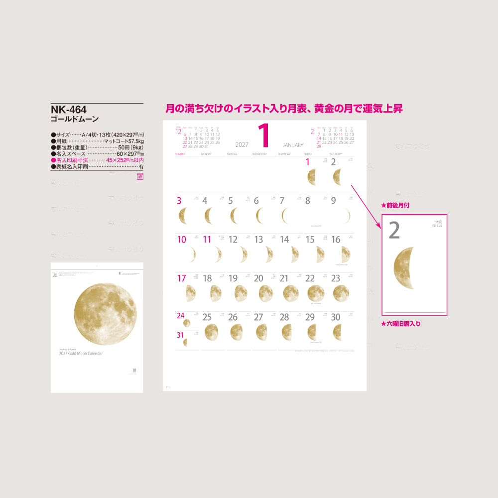 月の満ち欠けのイラスト入り月表、黄金の月で運気上昇