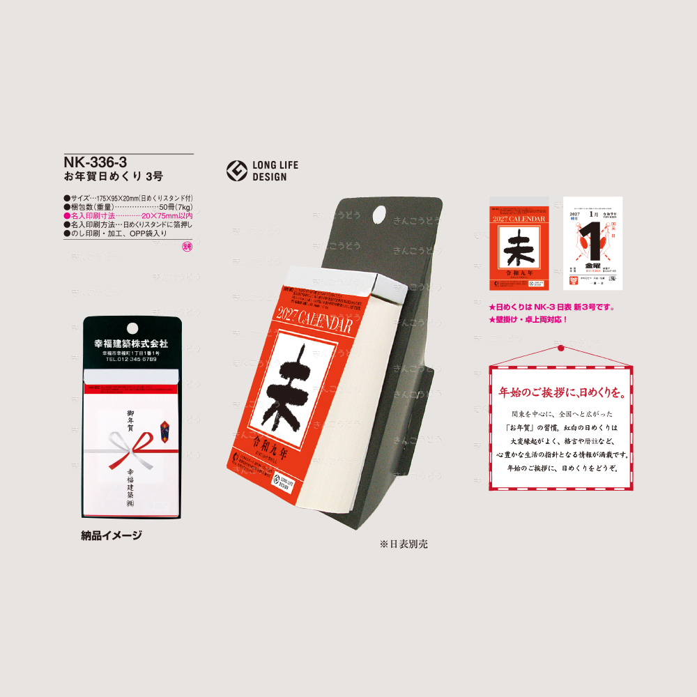 [注意]こちらの商品は、お年賀日めくりをご選択すると、「のし紙(印刷入り)・OPP袋封入加工」までセットでの納品になります。別途有料(お見積もり下さい。)