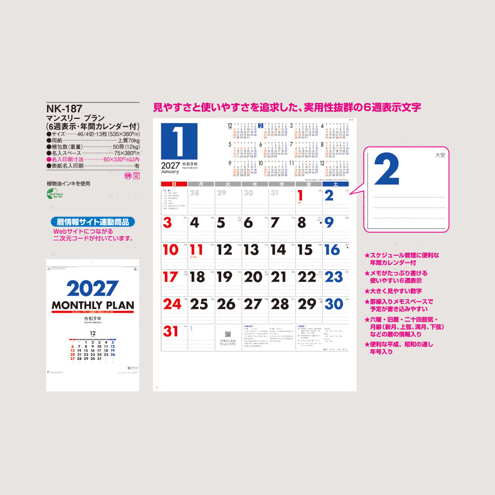 【NK-187】マンスリー プラン(6週表示・年間カレンダー付)
