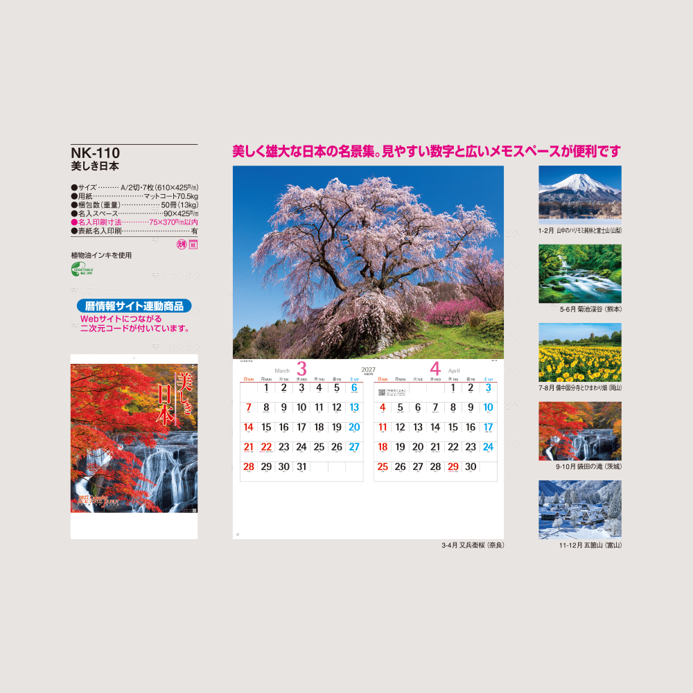 ●1-2月・山中のハリモミ純林と富士山(山梨) ●3-4月・又兵衛桜(奈良) ●5-6月・菊池渓谷(熊本) ●7-8月・備中国分寺とひまわり畑(岡山) ●9-10月・袋田の滝(茨城) ●11-12月・五箇山(富山)