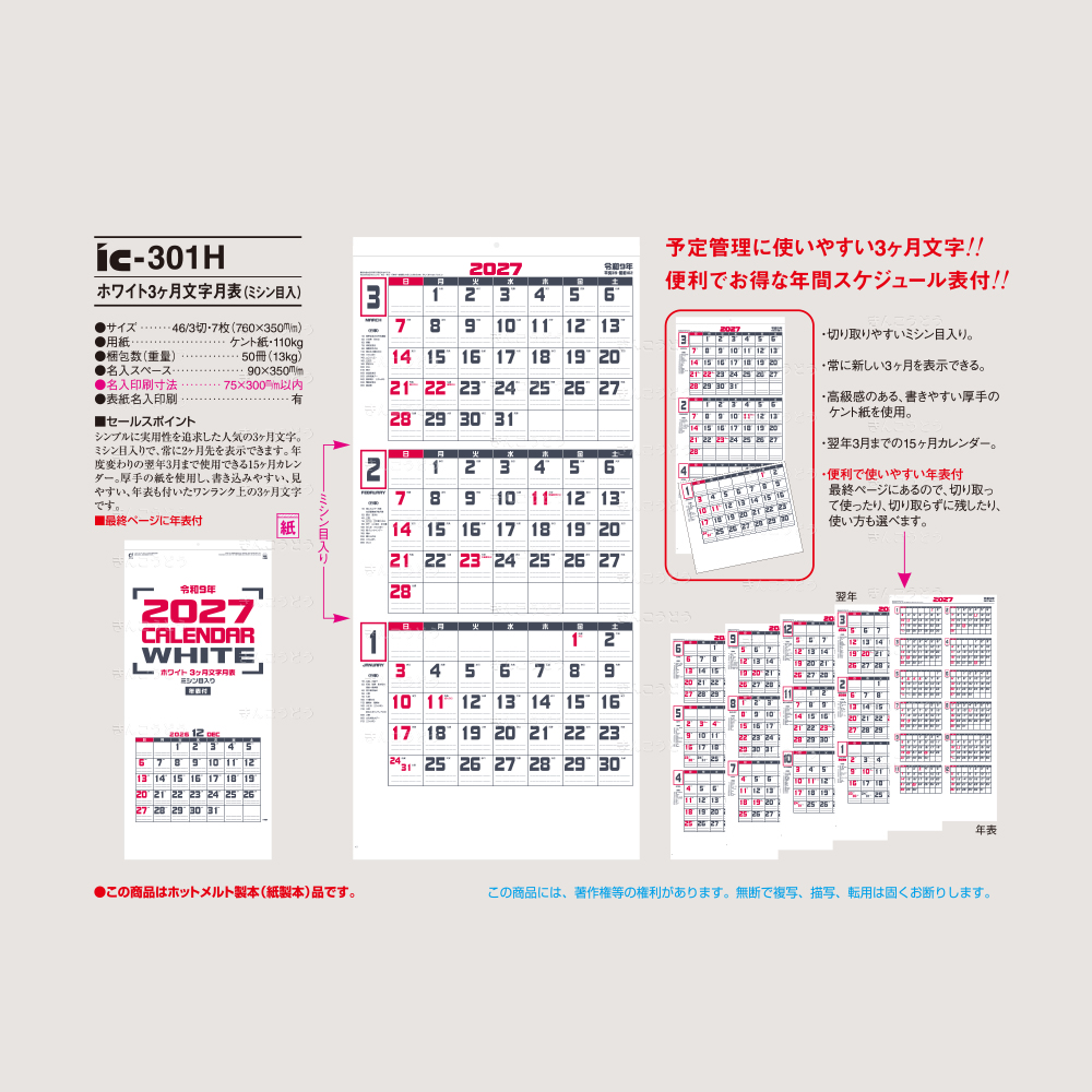 【IC-301H】ホワイト3ヶ月文字月表(ミシン目入)