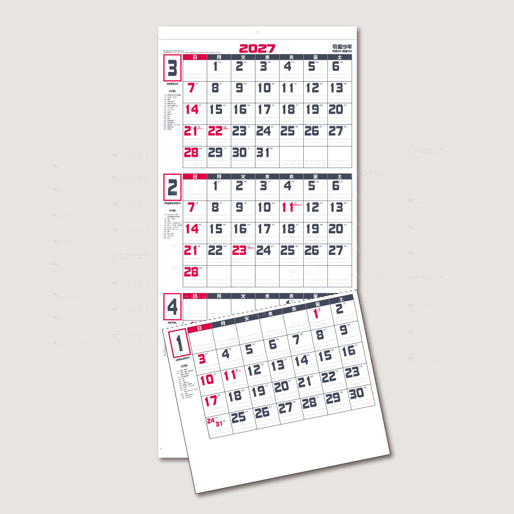 シンプルに実用性を追求した人気の3ヶ月文字。ミシン目入りで、常に2ヵ月先を表示できます。年度変わりの翌年3月まで使用できる15ヶ月カレンダー。厚手の紙を使用し、書き込みやすい、見やすい、年表も付いたワンランク上の3ヶ月文字です。