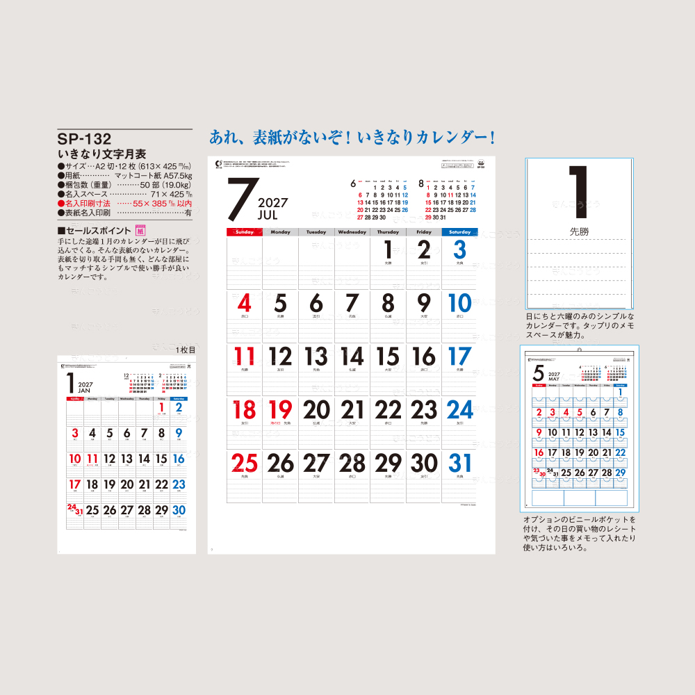 既製品カレンダーからお好きな商品・豊富な品揃えでお好みの品番のカレンダーに名入れをしてお届けいたします。
