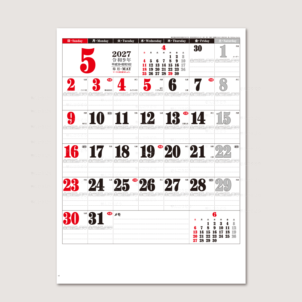 生活関連アイコン付の新感覚文字月表です。色分できるアイコンや充実したメモ欄はスケジュール管理に最適です。「見やすさ」を追求するため、数字を大きくし、スペースをムダなく有効活用しました。機能性・実用性に富んだカレンダーです。
