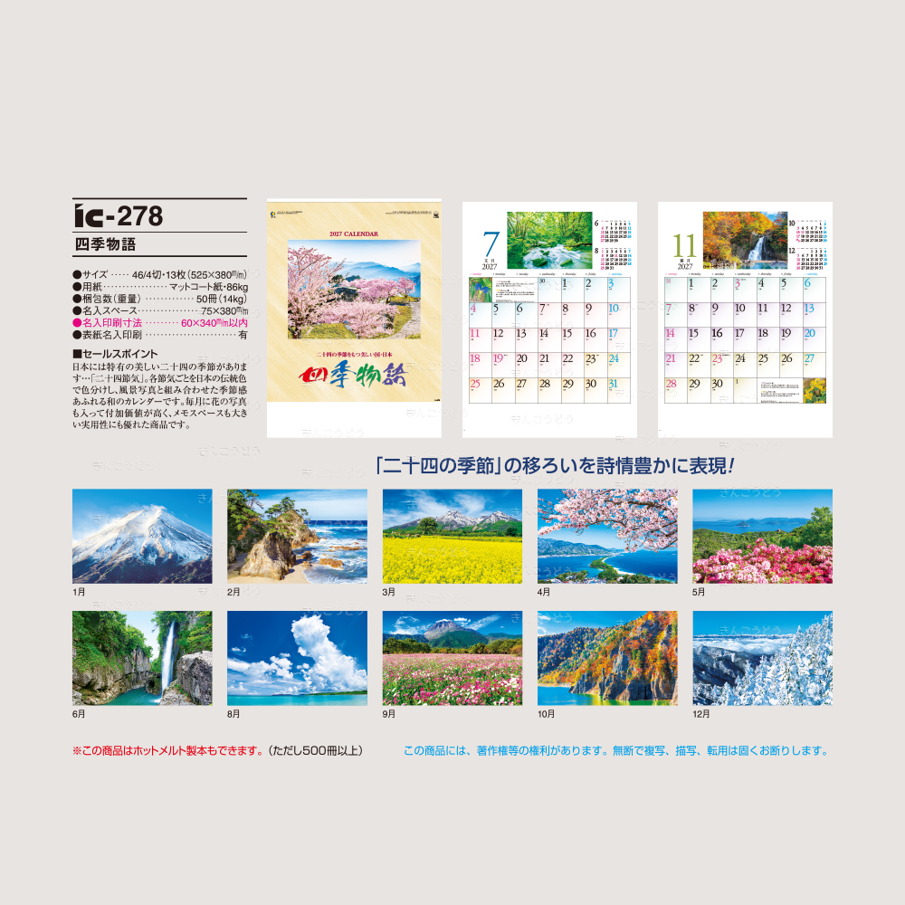 日本には特有の美しい二十四の季節があります・・・「二十四節気」。各節気ごとを日本の伝統色で色分し、風景写真と組み合わせた季節感あふれる和のカレンダーです。毎月に花の写真も入って付加価値も高く、メモスペースも大きい実用性にも優れた商品です。
