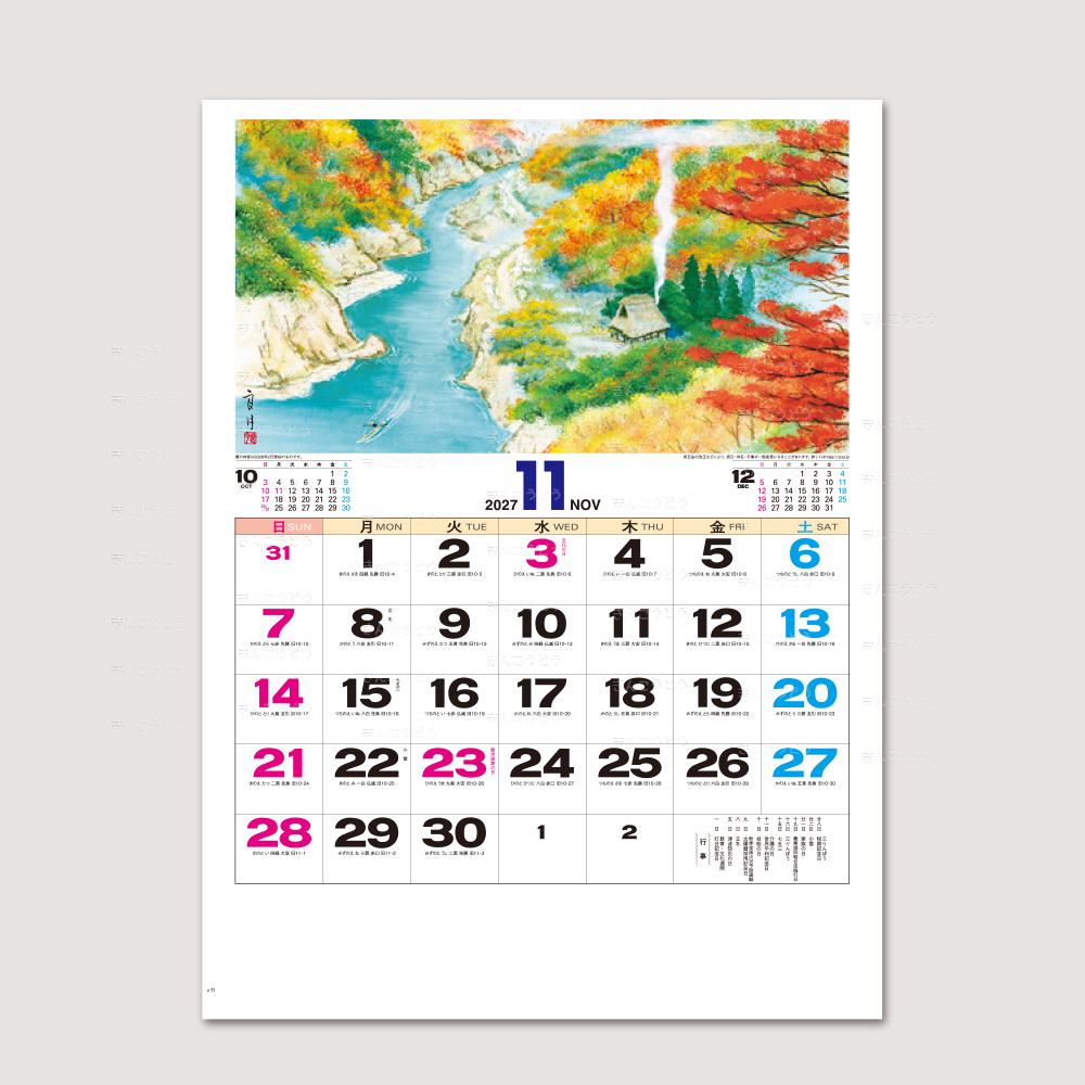 思わず人の心をほのぼのさせる自然につつまれた静かな山里をやさしく、明るいタッチで描かれた山水画です。メモ欄も十分有り実用性を兼ね備えた郷愁感あふれるカレンダーです。