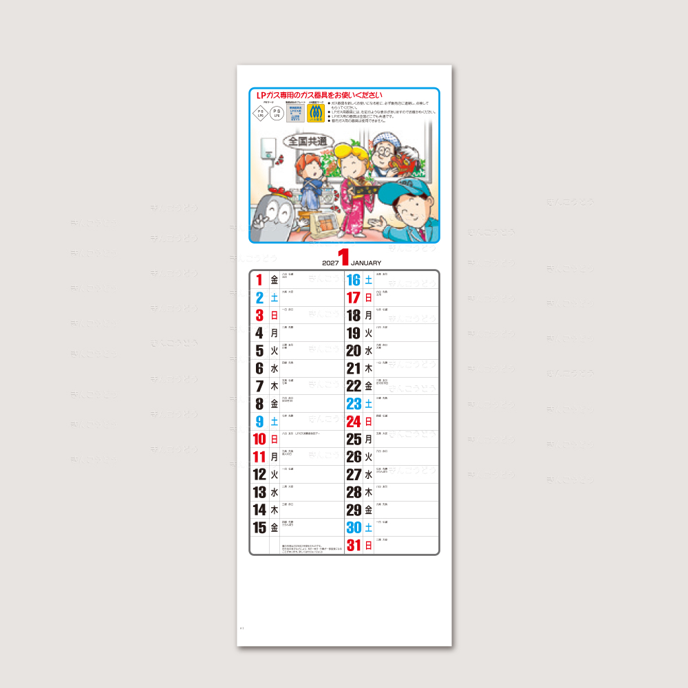 プロパンガス(LPガス)の正しい使い方・豆知識がかわいいイラストで表した実用性のあるカレンダーです。メモ欄も大きく機能性にも兼ねたカレンダーです。