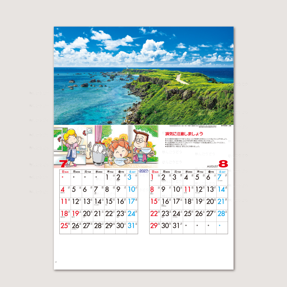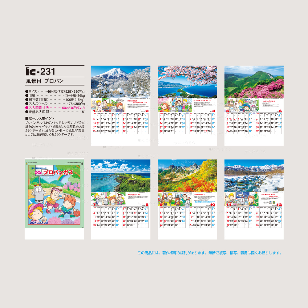 プロパンガス(LPガス)の正しい使い方・豆知識をかわいいイラストで表した実用性のあるカレンダーです。また美しい日本の風景写真集としても、2通り楽しめるカレンダーです。