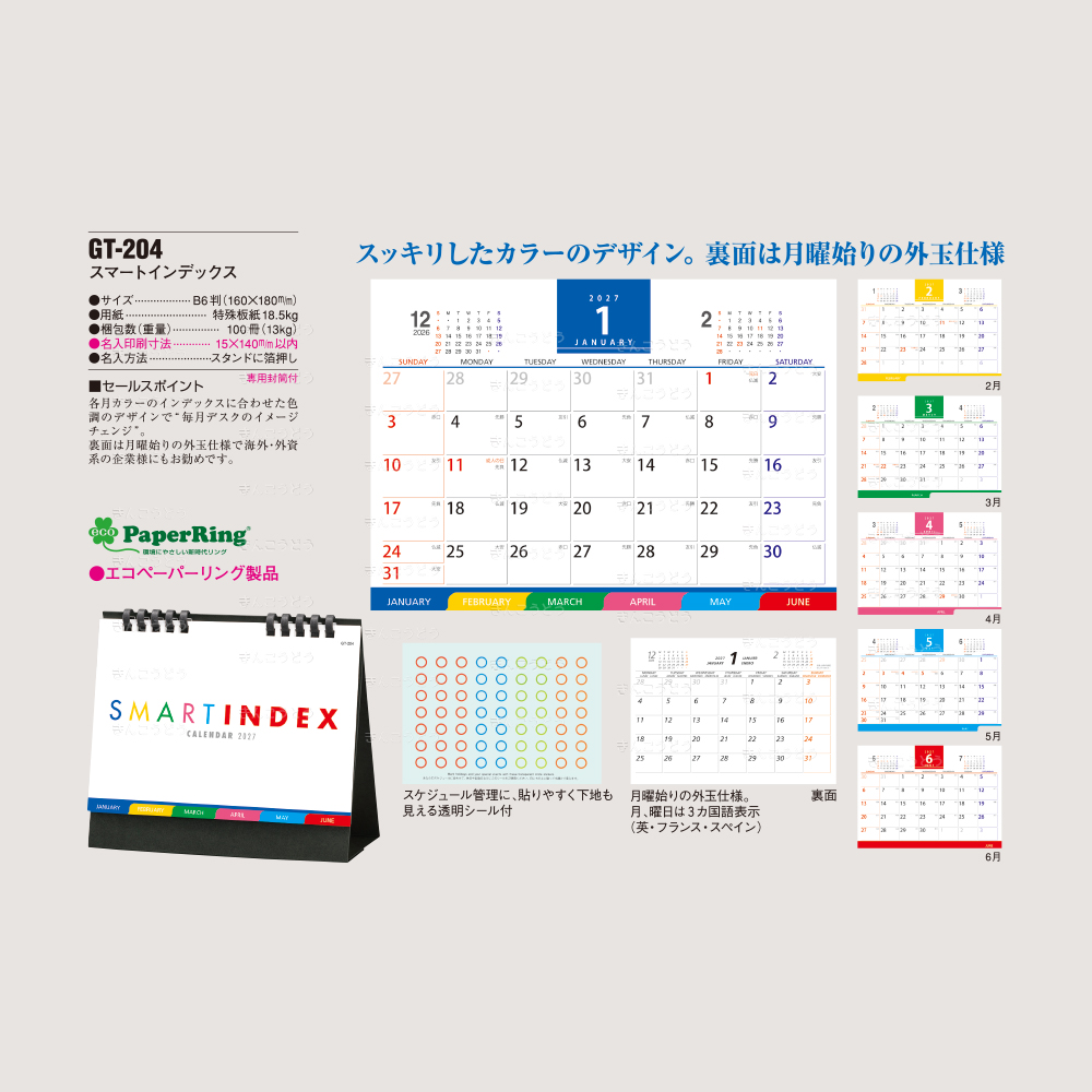 各月カラーのインデックスに合わせた色調のデザインで、〝毎月デスクのイメージチェンジ″。裏面は、月曜始まりの外玉仕様で海外・外資系の企業様にもお勧めです。