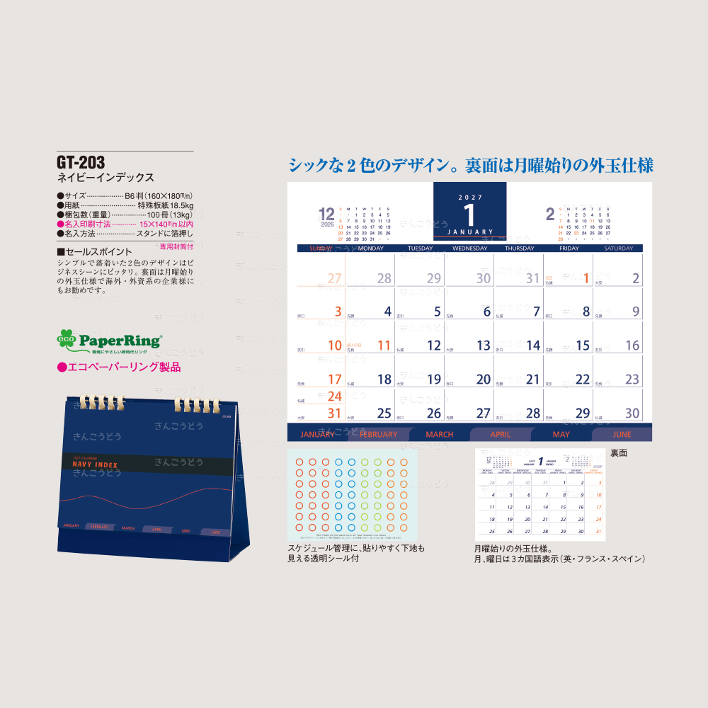 シンプルで落ち着いた2色のデザインはビジネスシーンにピッタリ。裏面は月曜始りの外玉仕様で海外・外資系の企業様にもお勧めです。