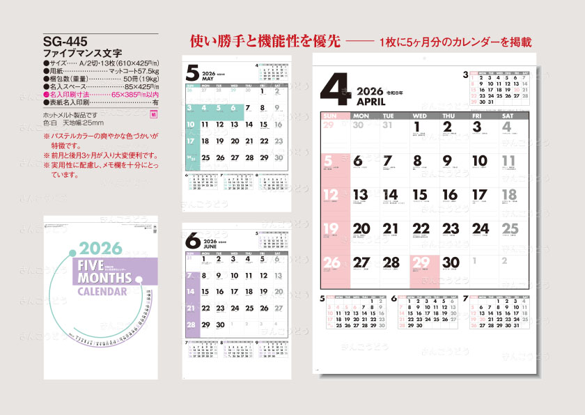 1枚に5ヶ月分のカレンダーを掲載