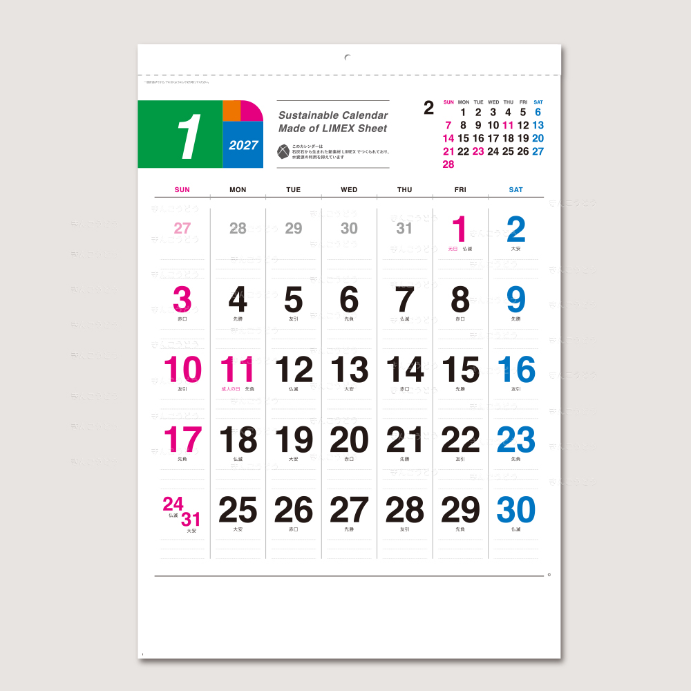石灰石から生まれたライメックスシートを用紙に採用した壁掛けカレンダー。ライメックスシートは森林伐採せず、水をほぼ使わずに作られるため、紙と代替することで地球環境への負荷を軽減できます。紙のカレンダーと同様に鉛筆やボールペンで書き込みができ、耐水性・耐久性にも優れた素材です。