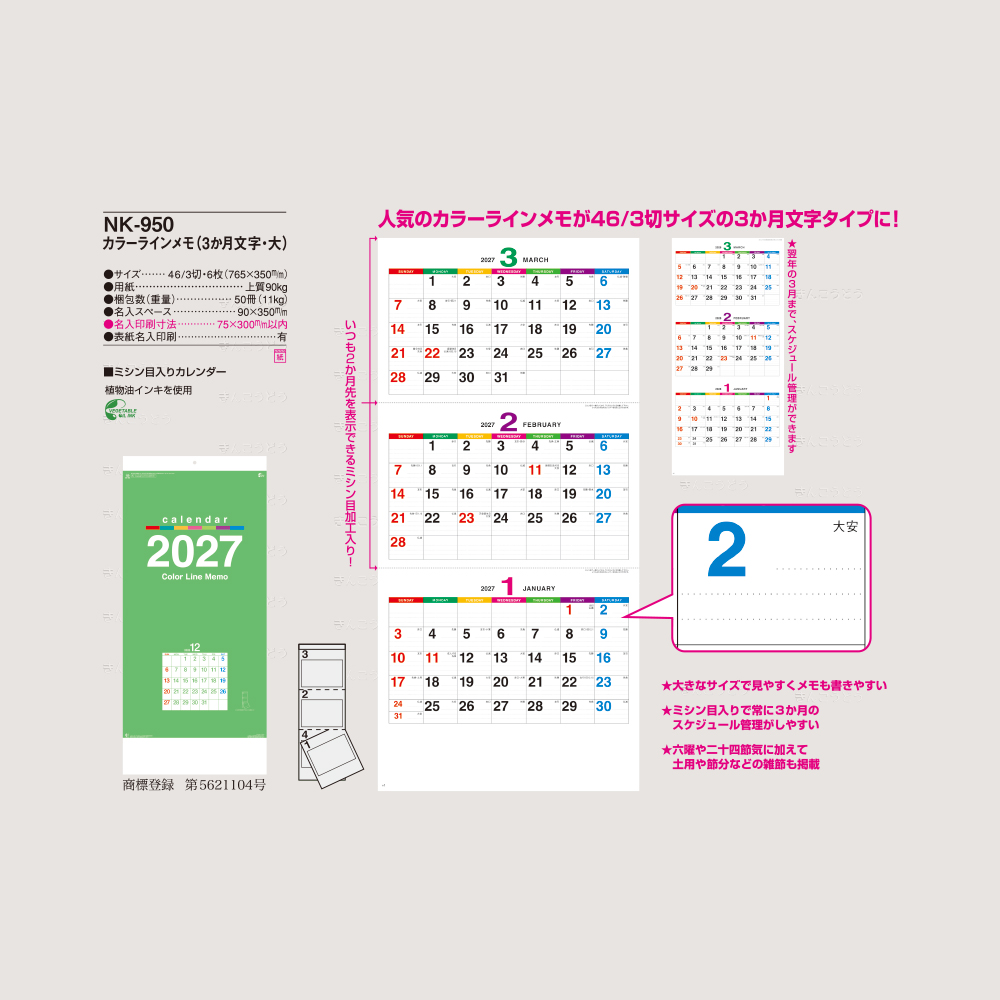 NK-950 カラーラインメモ(3か月文字・大)(46/3切・6枚・765×350㎜)