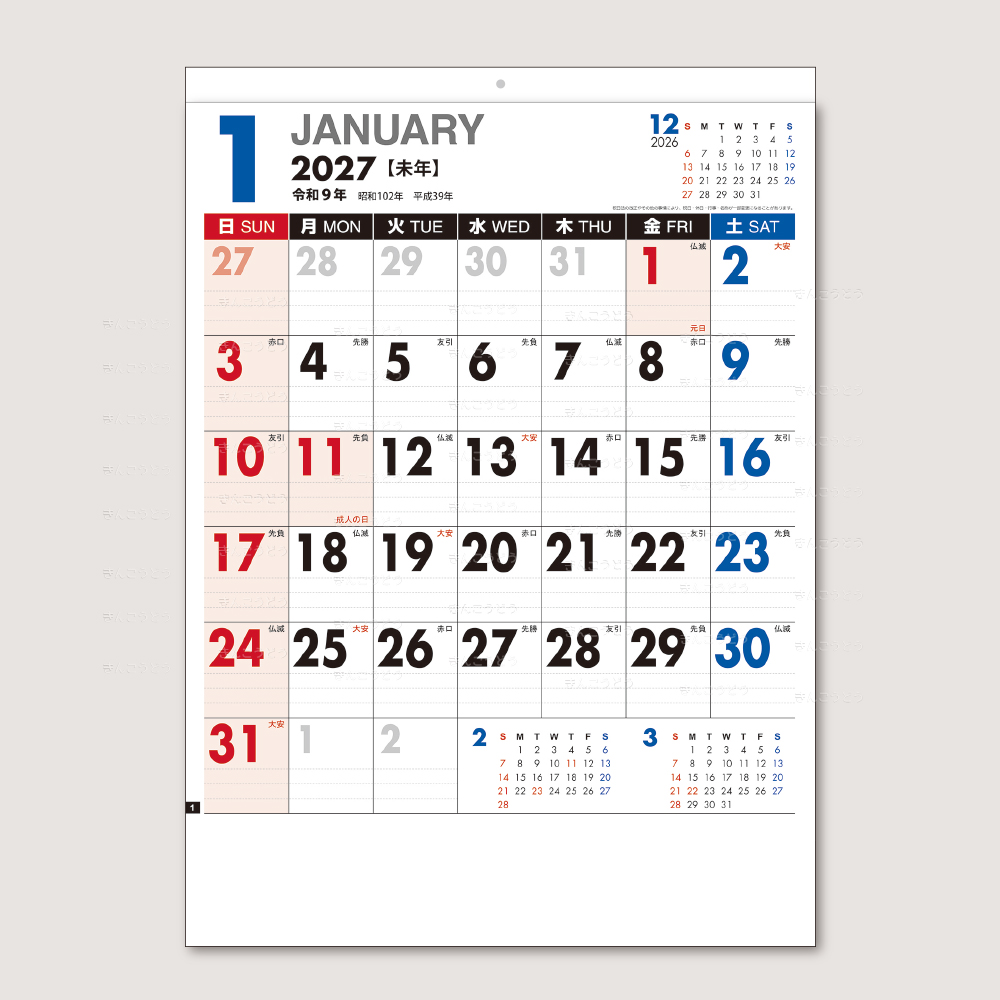 ★見やすい文字、6週表記、広いメモ欄、色付きの日曜・祝日表記など、機能性も抜群の壁掛けカレンダーです。