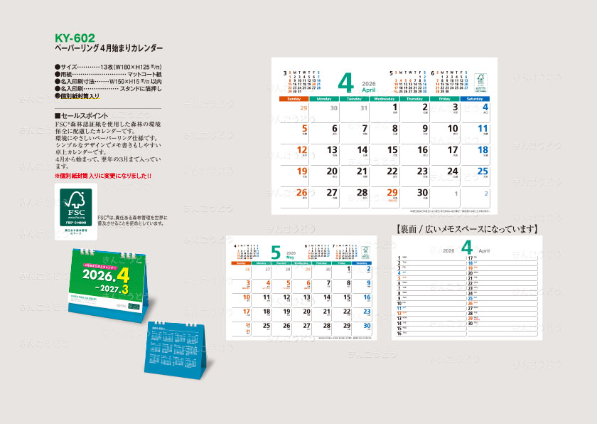 【KY-602】ペーパーリング 4月始まりカレンダー
