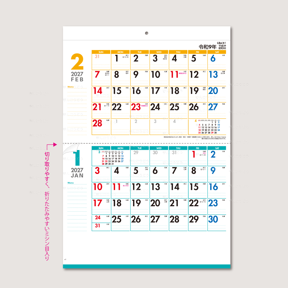 シンプルで見やすいファインカラー2ヶ月文字。ミシン目入りで常に翌月2月まで使用できる14ヶ月カレンダーです。ミシン目で折りたたむことにより、角2封筒で郵送も可能です。