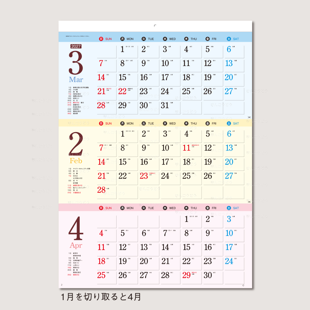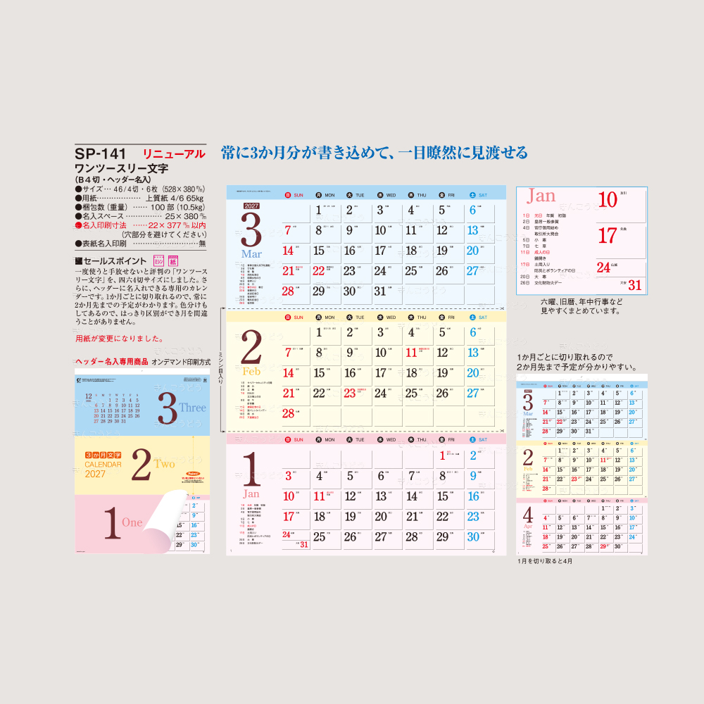 一度使うと手放せないと評判の「ワンツースリー文字」を、四六4切サイズにしました。さらに、ヘッダーに名入れできる専用のカレンダーです。1か月ごと切り取れるので、常に2か月先までの予定がわかります。色分けもしてあるので、はっきり区別ができ月を間違うことがありません。