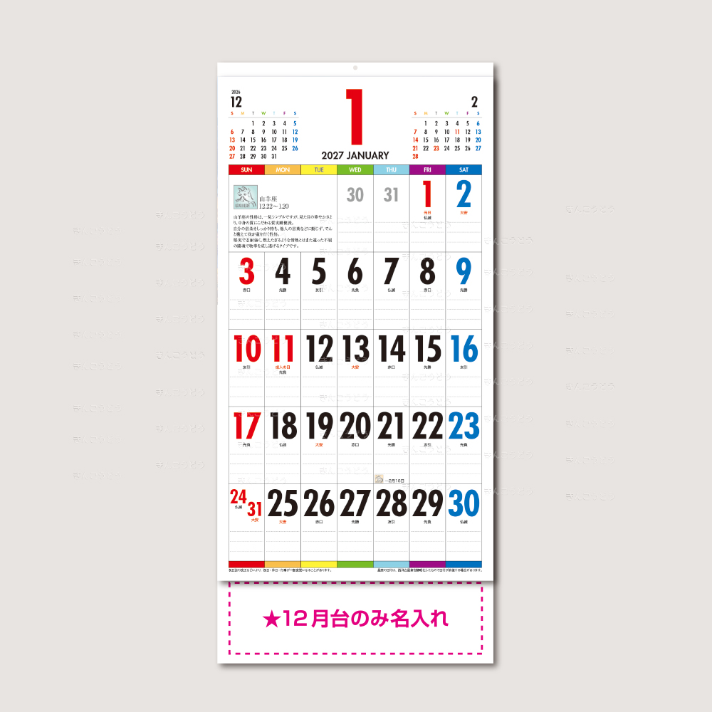 既製品カレンダーからお好きな商品・豊富な品揃えでお好みの品番のカレンダーに名入れをしてお届けいたします。