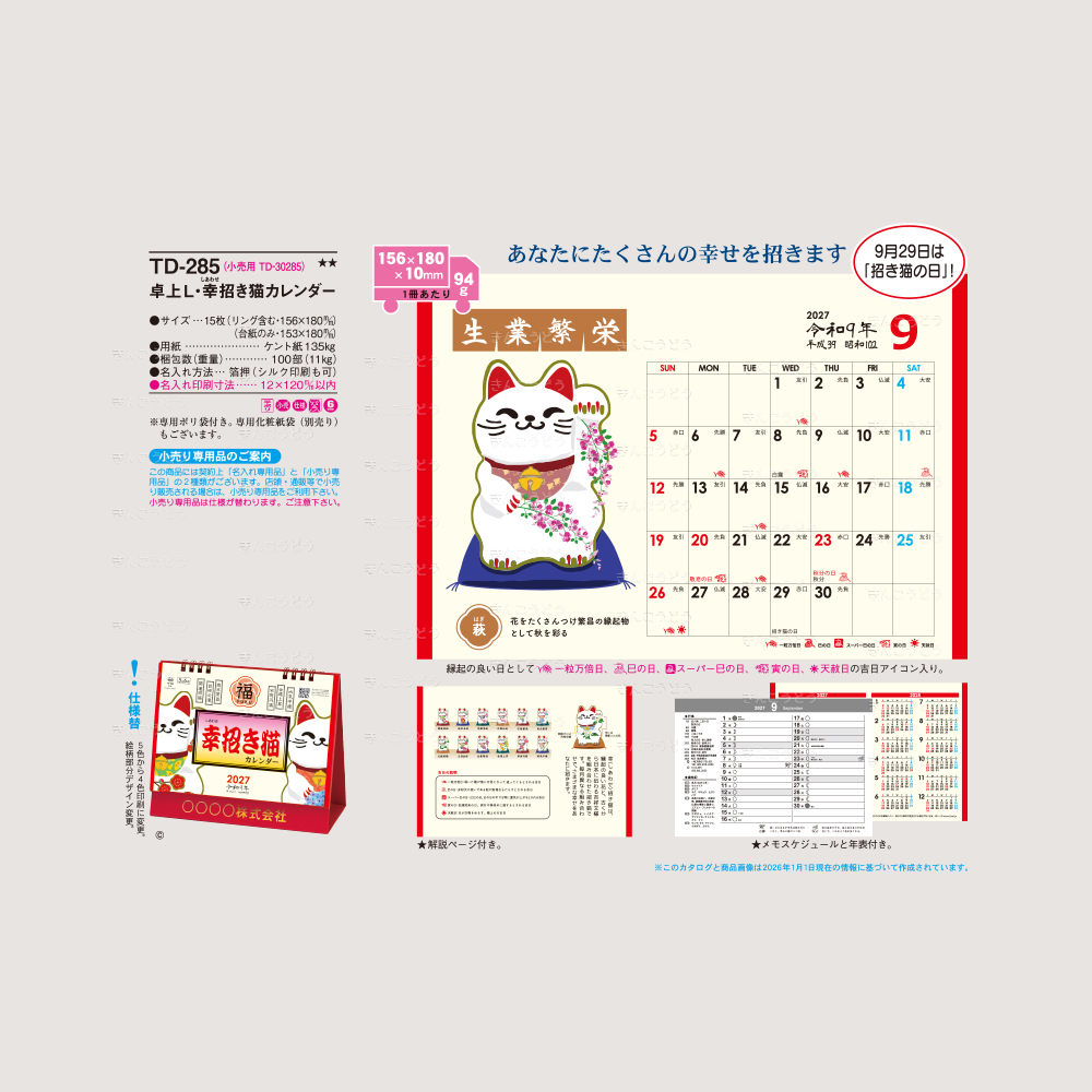 TD-285 卓上L・幸招き猫カレンダー(15枚・156×180㎜)