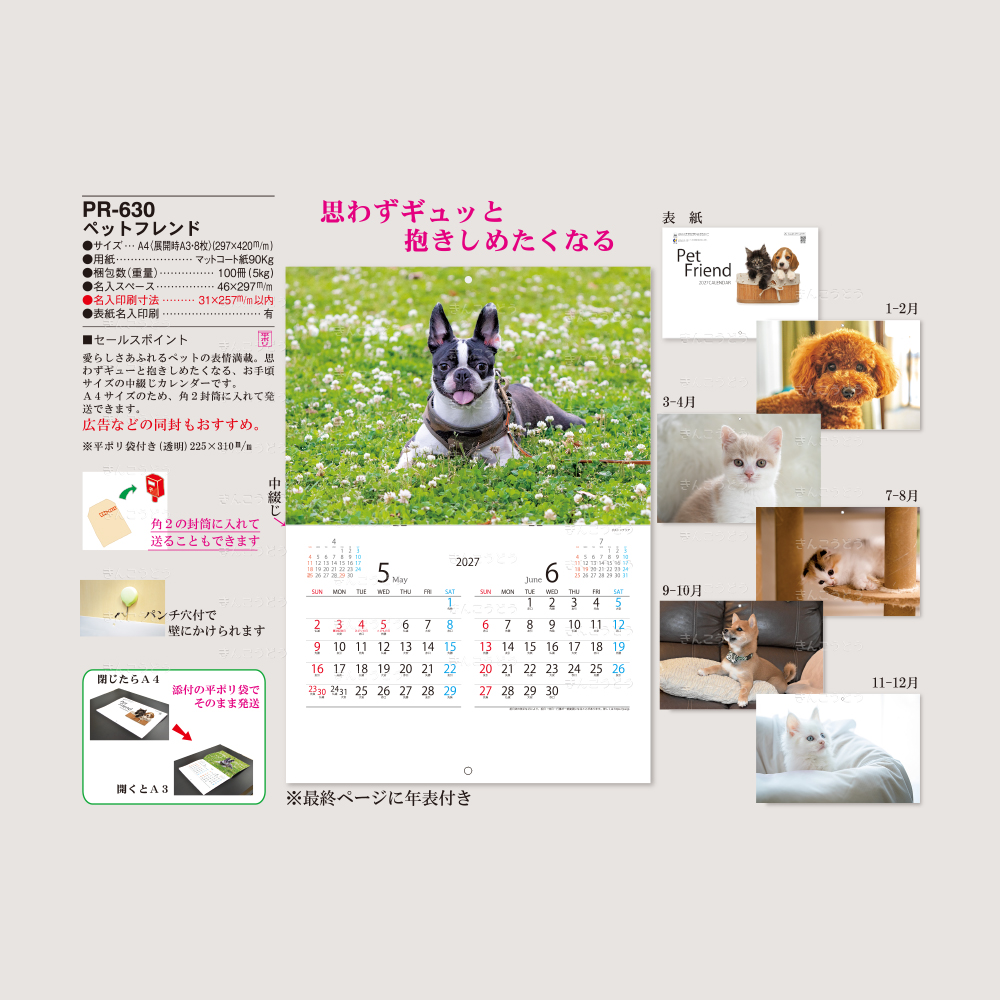 愛らしさあふれるペットの表情満載。思わずギュッと抱きしめたくなる、お手頃サイズの中綴じカレンダーです。