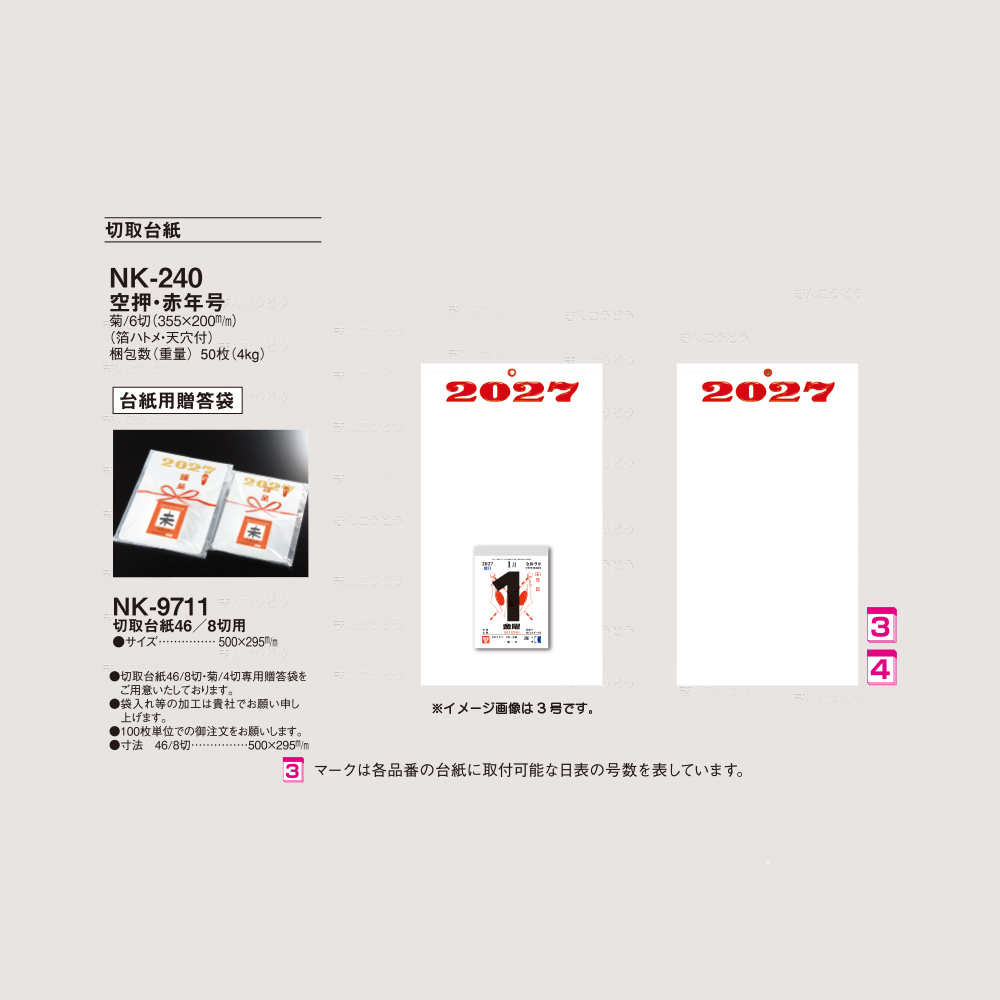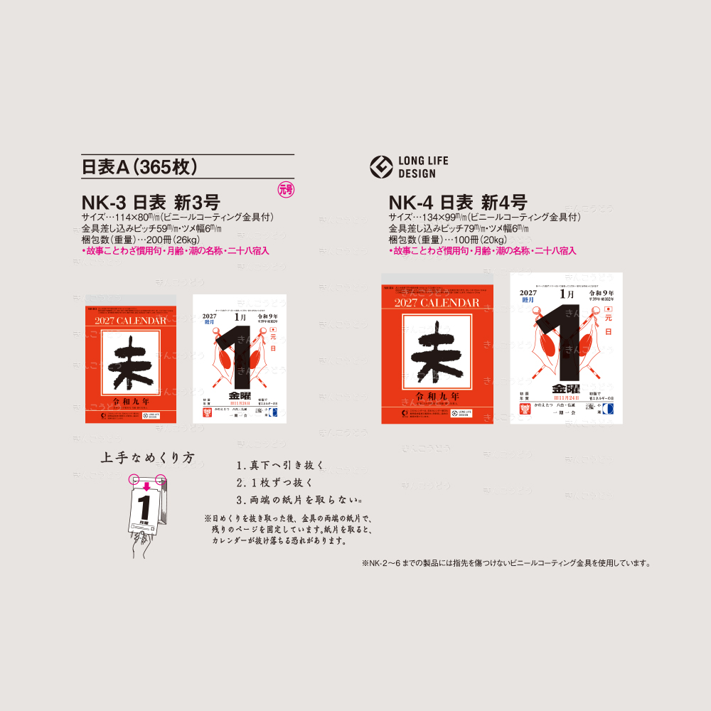 | 梱包数(重量) | 台紙・50枚(4Kg)|日めくり・200冊(26Kg) |