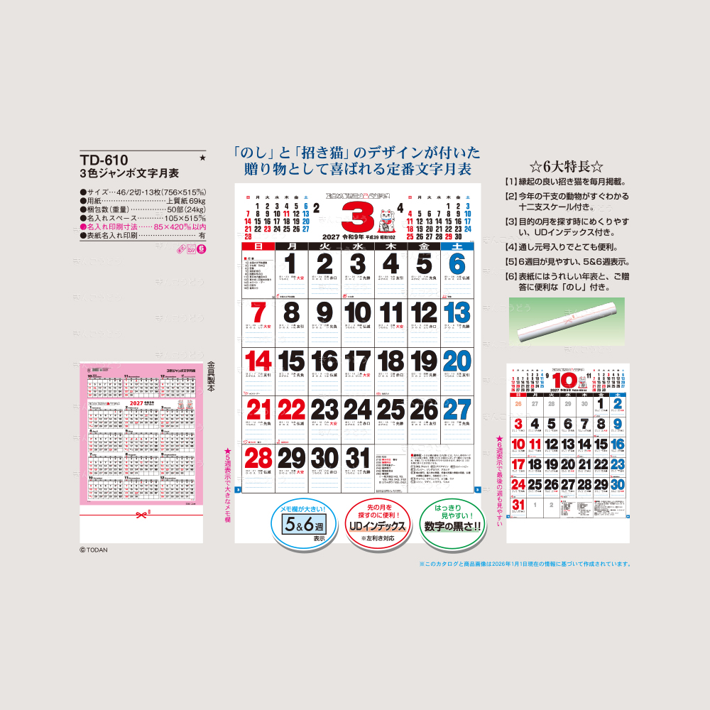 TD-610 3色ジャンボ文字月表(46/2切・13枚・756×515mm)